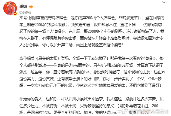 谢娜写给张杰张杰 200 场演唱会获谢娜长文表白!赞他 “为 live 而生”,