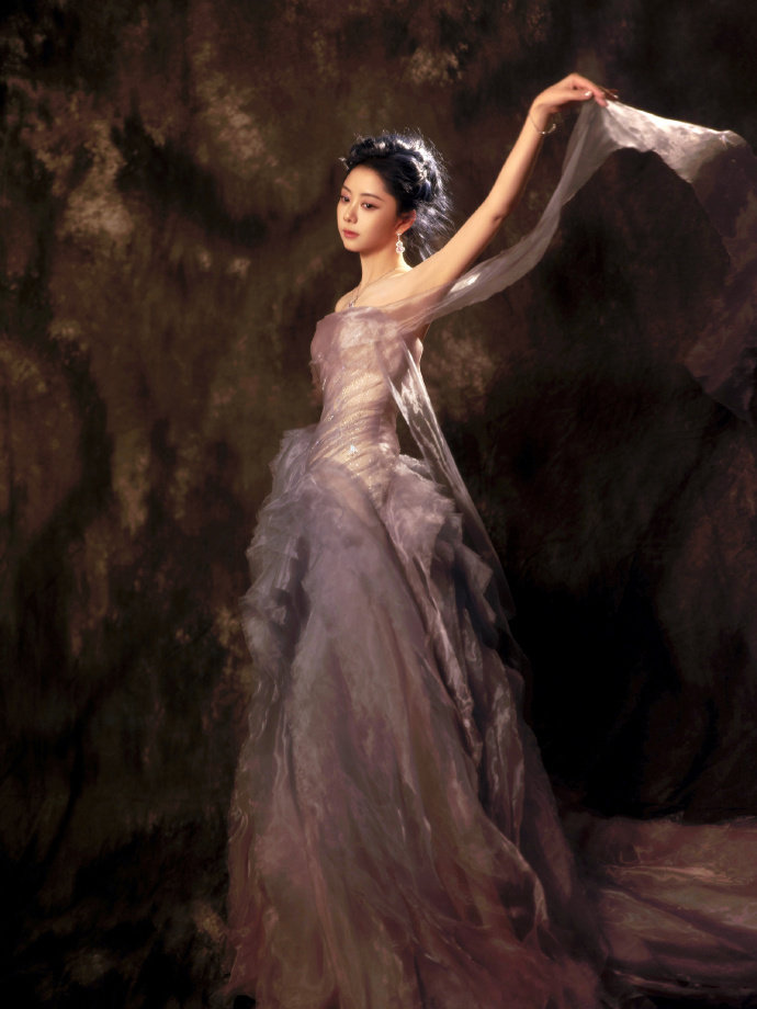 谭松韵紫色抹胸纱裙 谭松韵紫色抹胸纱裙,谭松韵腾讯视界大会造型图,完全就是优雅复古的油画美人啊~