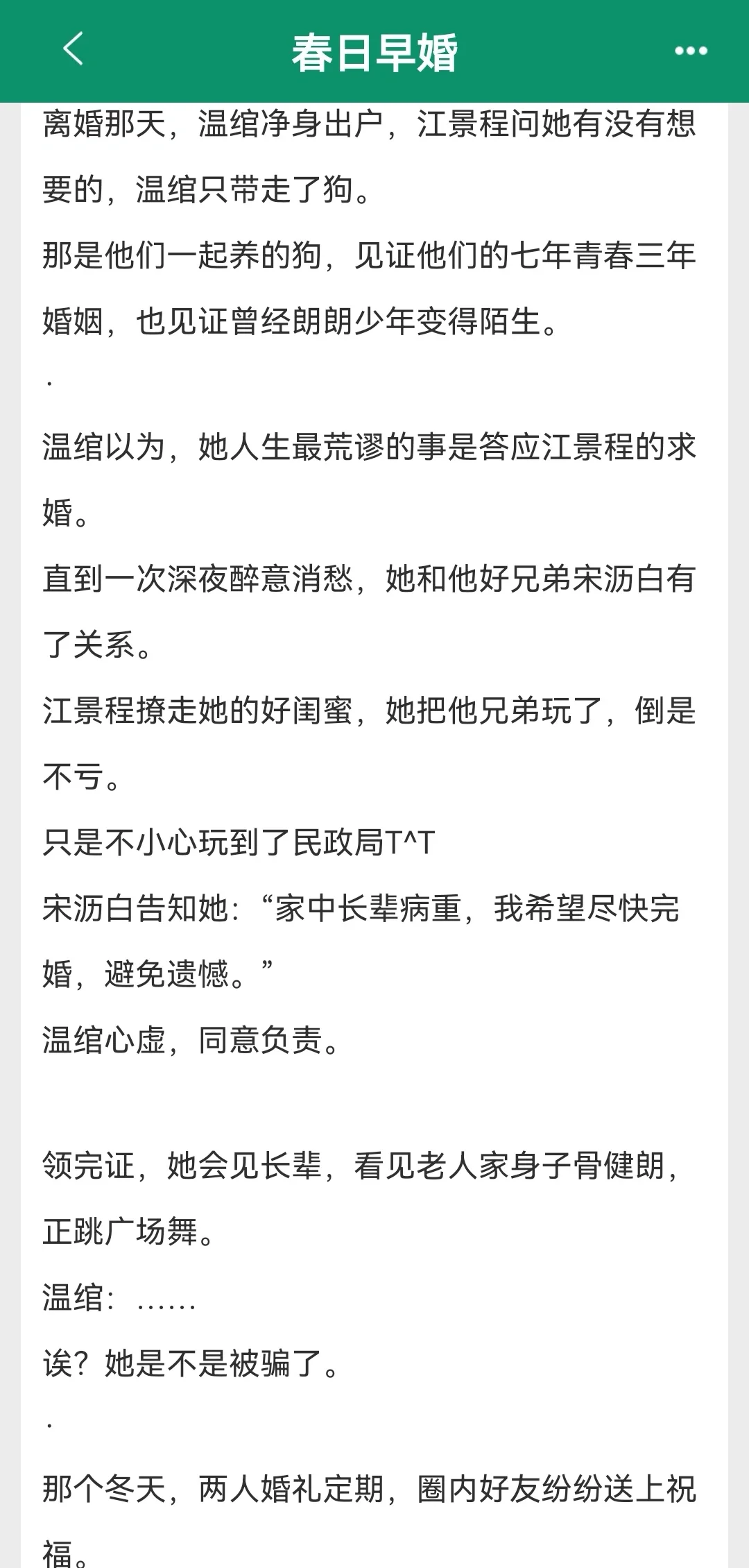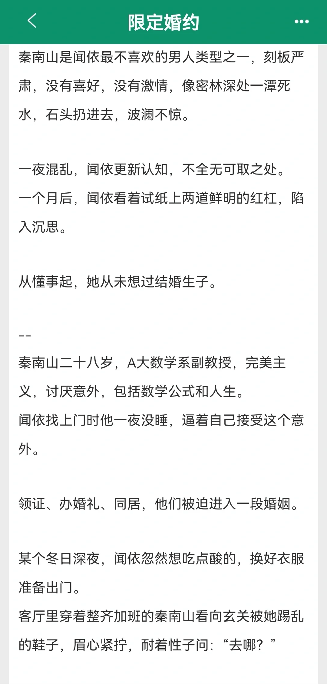 强推《限定婚约》!!!这本主角人设真的超级特别,特别戳我!先孕后爱,男女主因为意外睡了之后女主就怀孕了,女主原本是个崇尚自由的不婚主义,结果这个孩子的到来打乱了她的计划。男主是个极致完美主义者,数学教授,非常理智强大,超级优秀,绝对的智性恋天菜!很特别的人设,两人商议后结婚了,婚后男主对女主非常好,尽心尽责照顾孕期的她,女主也一点点被男主身上的闪光点打动,两人逐渐互相吸引,最后真的相爱了!!!男主真的就是标准的,本身就是一个很好的人,非常负责任,成熟稳重巨靠谱。