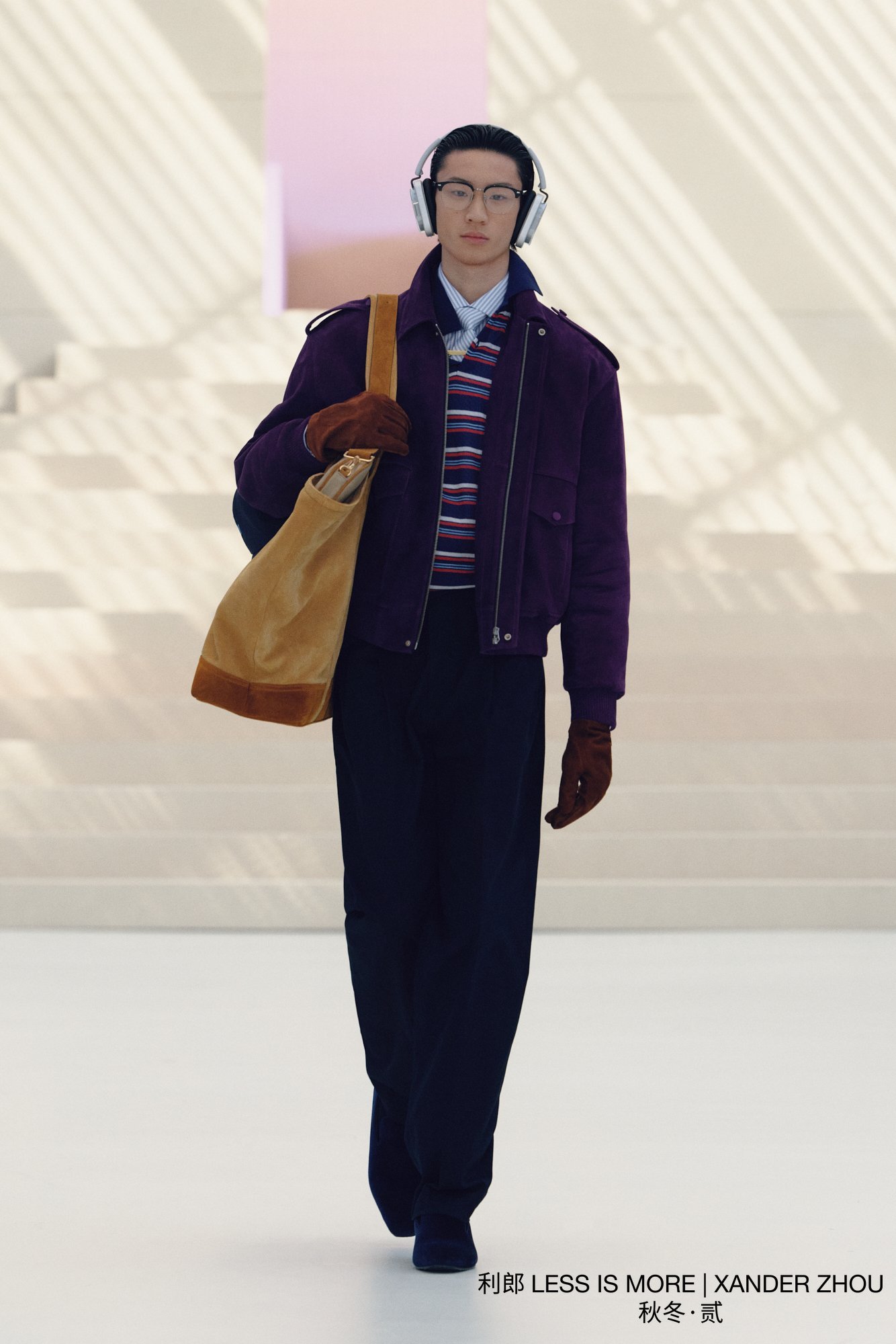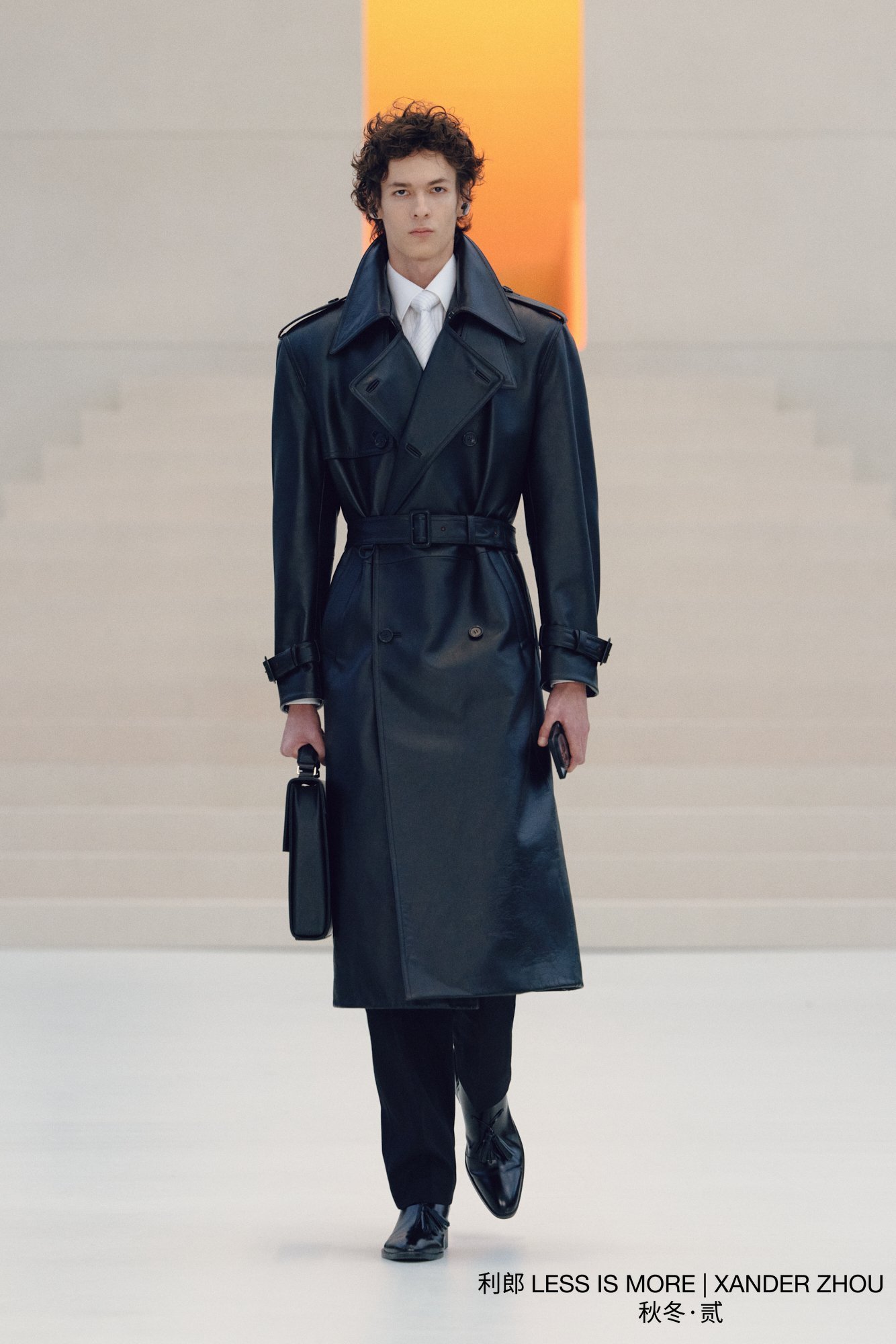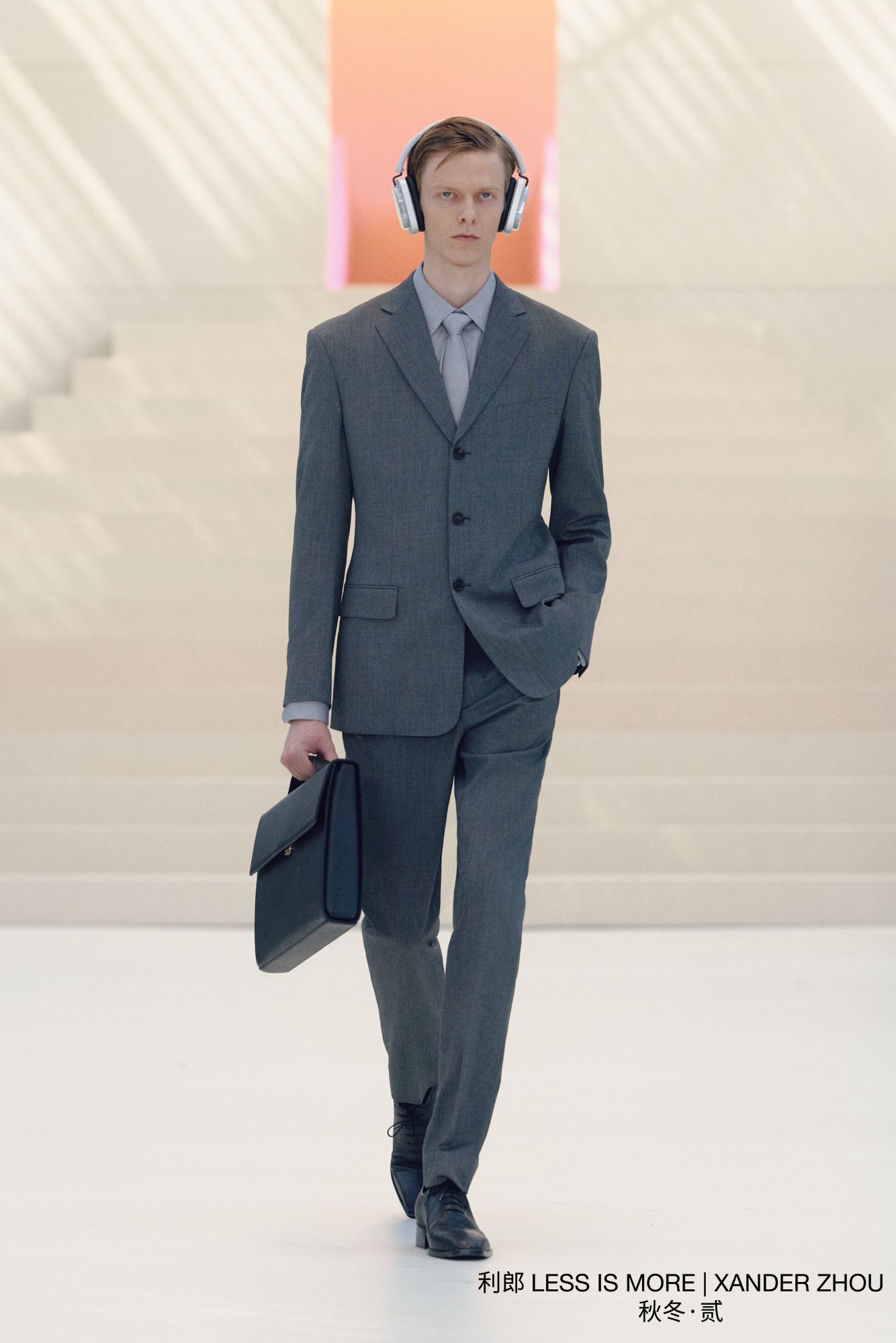 西装、大衣构建“理性衣橱”骨架,健身包、公文包打造完整搭配系统,既诠释“形而上谓之道,形而下谓之器”的东方哲思,又践行“青年商务本该轻松”的时尚主张。在这里,“少”是力量的平衡,“形”是思维的容器,为都市男性在商务、休闲、运动等多元场景中,呈现兼具质感与时尚感的“克制时髦”,书写当代男装从自然之物到文化建构的精神坐标。