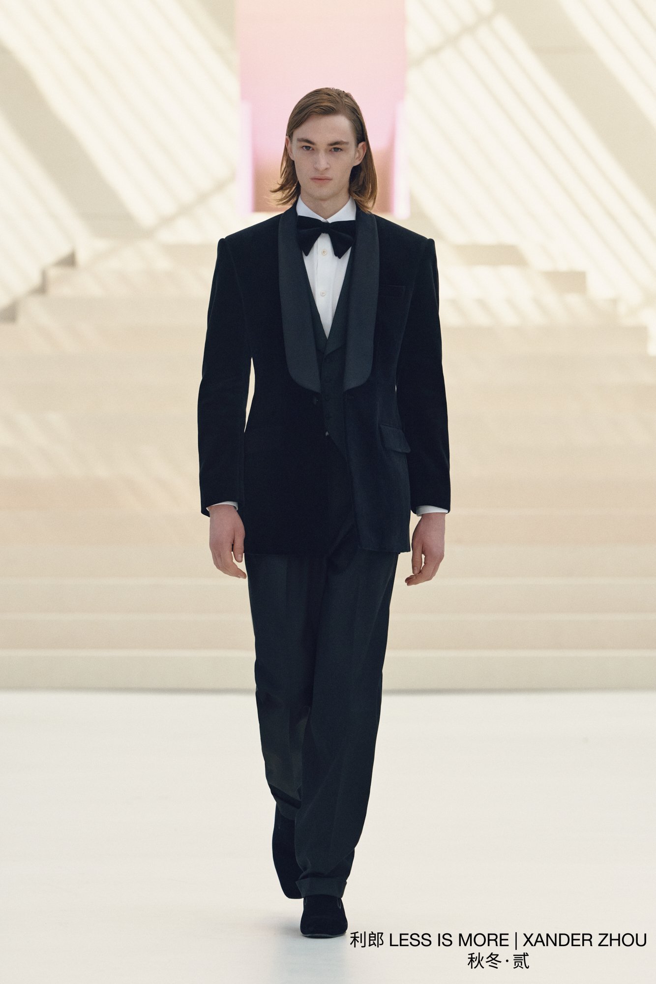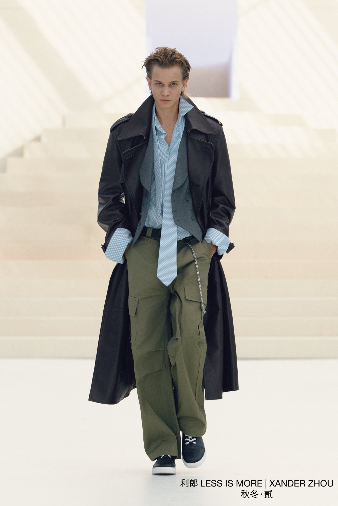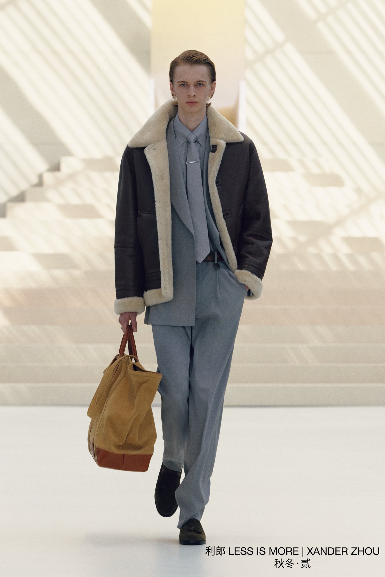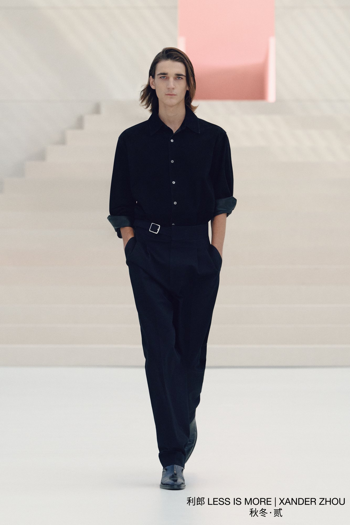 西装、大衣构建“理性衣橱”骨架,健身包、公文包打造完整搭配系统,既诠释“形而上谓之道,形而下谓之器”的东方哲思,又践行“青年商务本该轻松”的时尚主张。在这里,“少”是力量的平衡,“形”是思维的容器,为都市男性在商务、休闲、运动等多元场景中,呈现兼具质感与时尚感的“克制时髦”,书写当代男装从自然之物到文化建构的精神坐标。