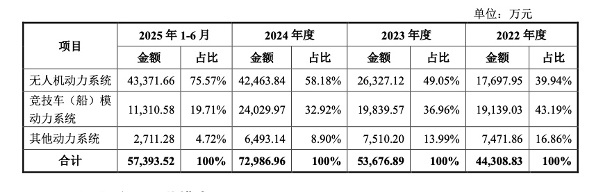 2022-2024年及今年上半年(下称:报告期),好盈科技来自无人机动力系统的收入分别约1.77亿、2.63亿、4.25亿、4.34亿元,占比分别为39.94%、49.05%、58.18%、75.57%,增速明显;来自竞技车(船)模动力系统的收入分别约1.91亿、1.98亿、2.40亿、1.13亿,稳中微降。