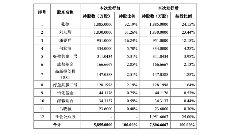 IPO后,张捷直接持有好盈科技24.15%股份,刘友辉持股23.44%。此外,成都基金持股2.13%,高新投创投(SS)持股1.88%。