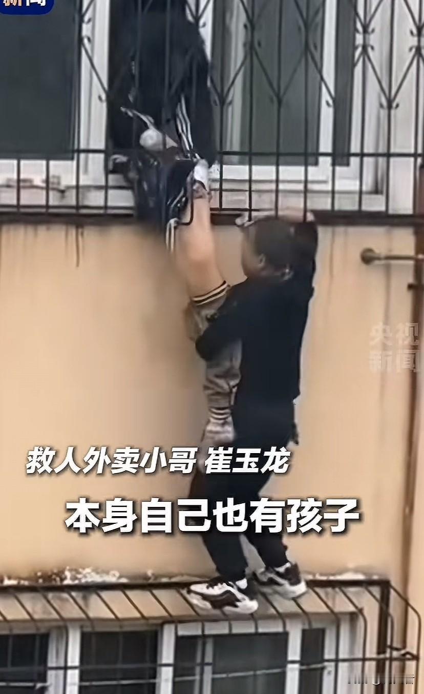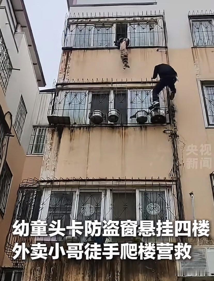 紧急情况又是外卖小哥,真是无所不能,徒手爬到四楼,救卡在四楼阳台的小孩,平凡的英
