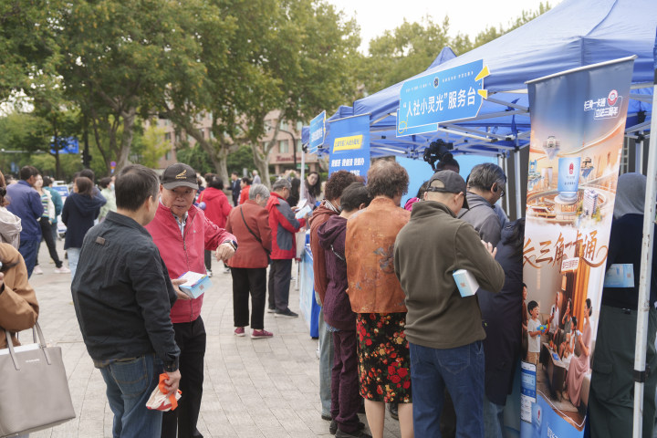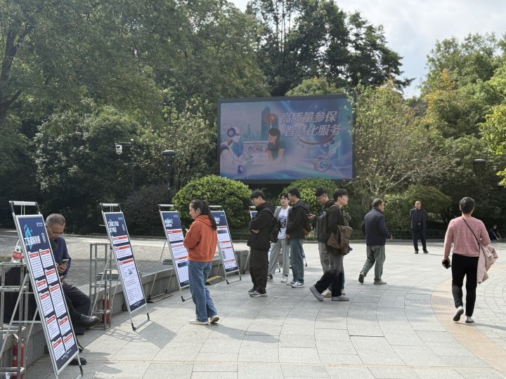 首站活动设置在涌金公园广场,12个政策咨询摊位和17张政策展板,详细展示了杭州社保政策。