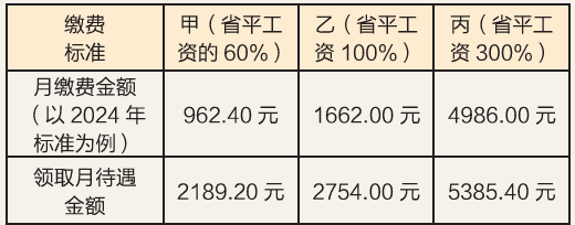 以连续缴纳最低年限15年的男性为例,甲,乙,丙三人2024年12月满60周岁退休,缴费标准分别按照上一年度省平基数的60%、100%、300%缴纳,退休后领取的养老待遇金额测算如下: