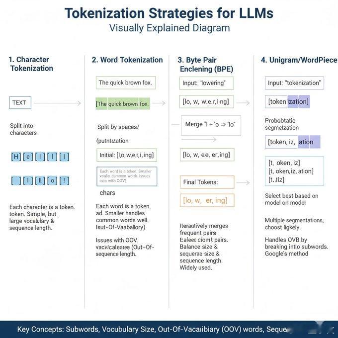 分词绝非小事,不同的分词策略会直接影响模型的性能、泛化能力、推理速度。以下是几种主流分词策略的拆解、背后逻辑,以及它们各自适用的场景: