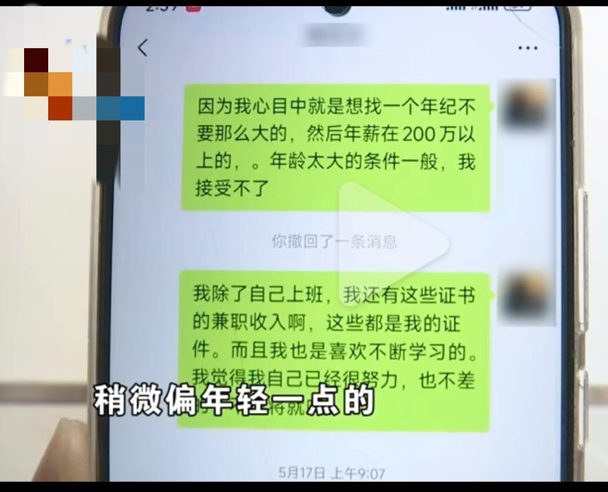 一女子27岁,离异带个娃。想要再找个对象组建一个新家庭。于是花了6万委托某相亲介绍所给介绍优质男性。钱花了,结果到头来介绍的都是五十岁左右的男性。刚还觉得这机构真不靠谱,人家才27岁,虽然离异,至少介绍40左右的吧。看到女生要求后,我发现我错了。原来机构是真拼老命了。 女子要求男方要在37岁以内,工作要稳定,在杭州必须要有房有车,年收入不低于200万,还要长的好看。许愿都不带这样许的吧。男方有这样的条件,脑袋被夹了也不会找她呀。这女子还是降智的看多了啊,把“霸总爱上离异带娃的我”当真了[笑哭]。相亲