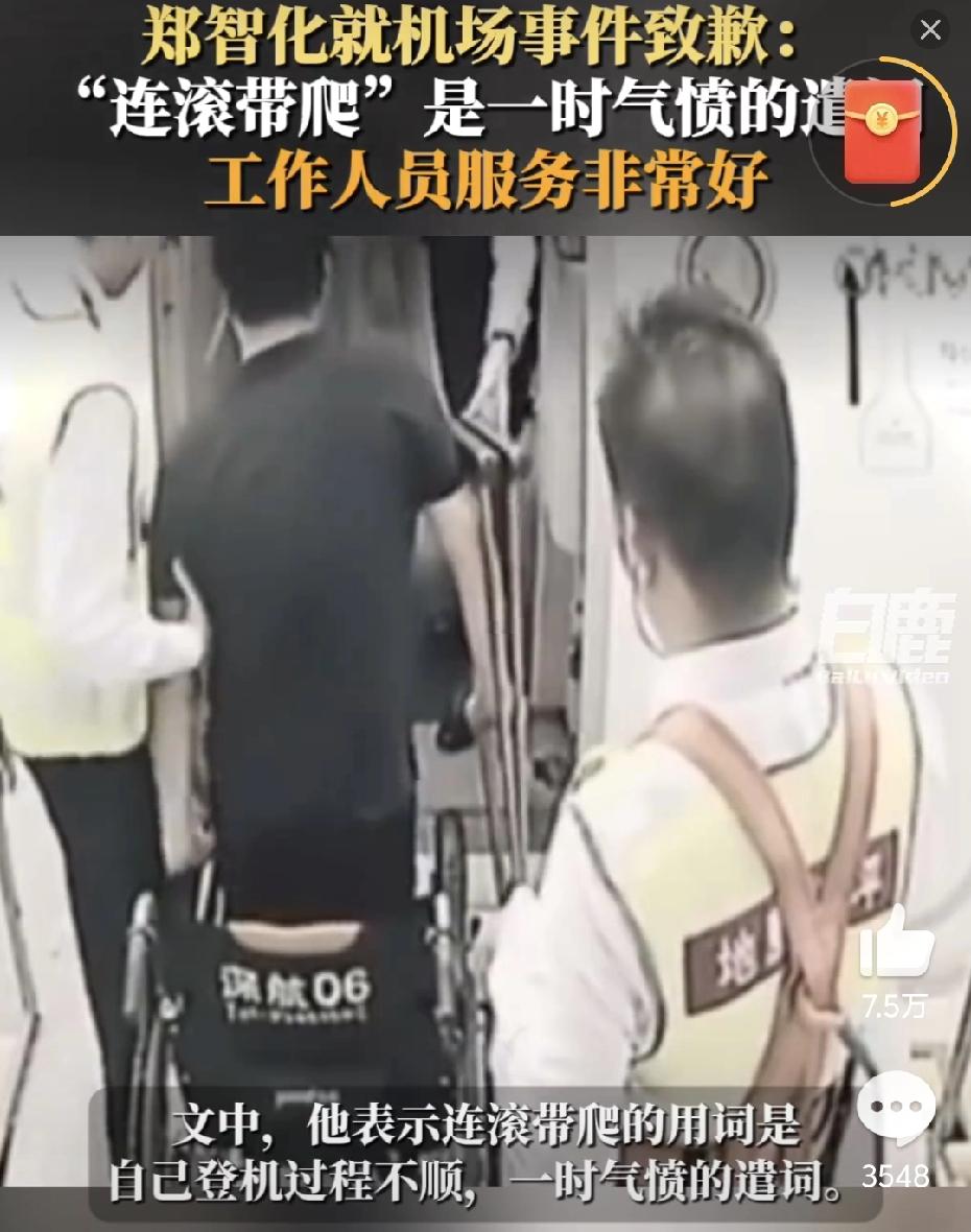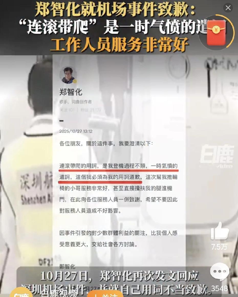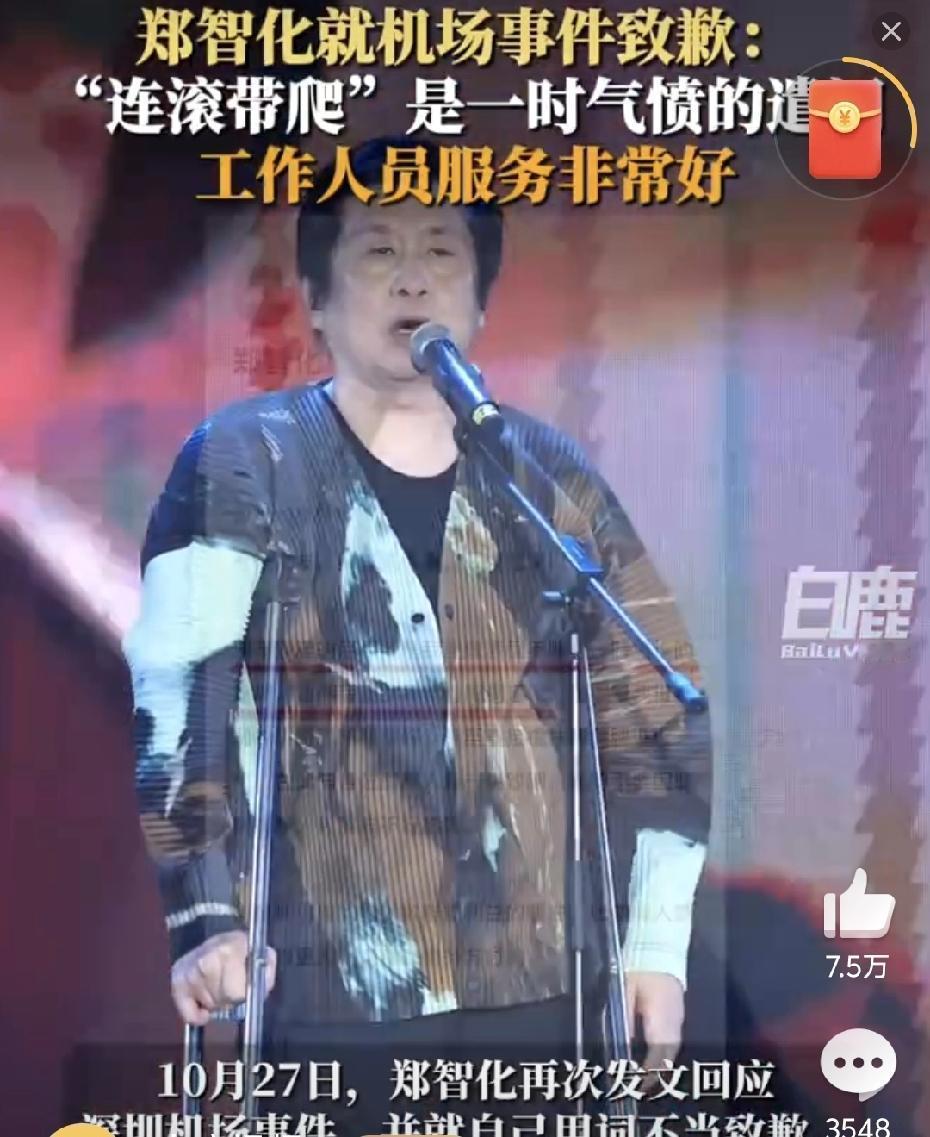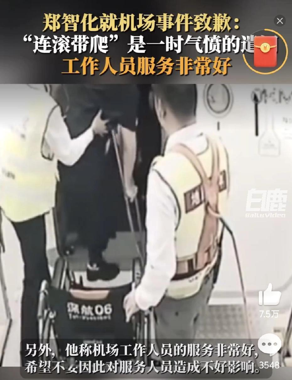 【郑智化致歉】 郑智化回应连滚带爬用词不当 近日,郑智化登机事件引起网民热议。尤其是视频发出之后,很多人批评郑智化的连滚带爬的描述有些夸大其词。10月27日,郑智化发文致歉,其文如下图