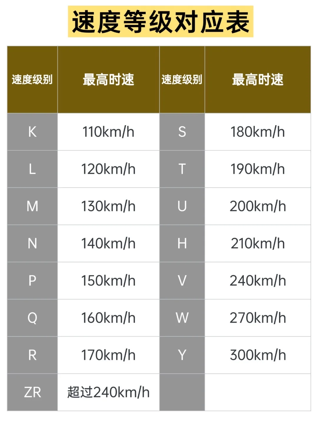 代表轮胎能承受的最高行驶速度,必须选和原厂轮胎一致或更高的等级!