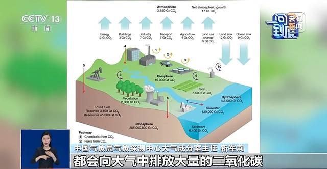 中国气象局气象探测中心大气成分室主任靳军莉:对二氧化碳来说,有能源、建筑、工业,还有交通,包括农业等,都会向大气中排放大量的二氧化碳。那么同时,在碳汇的方面,海洋和陆地的生态系统,都是碳的主要的碳汇。那么这两方面的这个共同作用就会决定了大气中温室气体的浓度是上升还是下降。