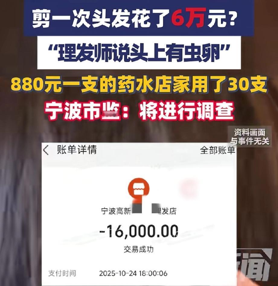 真是离了大谱,剪一次头发花了6万元,更离谱的是这位居然还把钱全额付款了!到底咋想的? 近期有网友反映,去理发店剪头发一次花了6万元,质疑理发店诱导消费。该网友表示 在理发期间,理发师称其头上有红疹,有虫卵,可以用药水清理,一支880元,店方使用了30支,药水费一共2.6万元,店方让其办理了6万元的套餐药水费和后续治疗费都可以从中扣除。 如果理发师都能治疗红疹,那么要医院干嘛?什么药水能药到病除?什么药到病除的药水需要880元一支?治疗什么病需要一次性打30支药水? 这么多的疑问,当时没有反应过来, 没有报警,没有求助,而是把钱全额交了,也真是服了。 在市场营销中,商家常常会采用各种策略来吸引消费者购买商品或服务。我们每天都会被各种消费信息包围,稍不留神就掉进各种消费陷阱里面,对商家的各种营销手段,消费者应保持清醒的头脑,理性判断商品或服务的真实价值,如果遇到可疑的引诱消费行为,可以向相关部门举报或寻求法律援助。 在付款之前一定要想一想你所购买的商品或所得到的服务值不值得你所付你所付出的价钱。最关键的是在消费之前一定要问清楚价格清单,最好是能去那种明码标价的店的消费。我们要懂得保护自己的合法权益,只有当我们都有一定的警惕性,判断性和解决问题的能力,那么他们这些消费陷阱便无处遁形了。 理发 理发天价收费 理发店天价收费