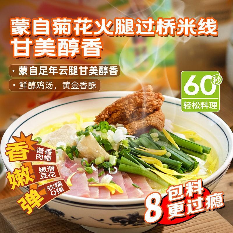 想要吃地道蒙自味的,一定要尝尝菊花火腿过桥米线。鲜醇鸡汤打底,金丝黄菊锦上添花,原色留香,清雅至味。这个好物闭眼入