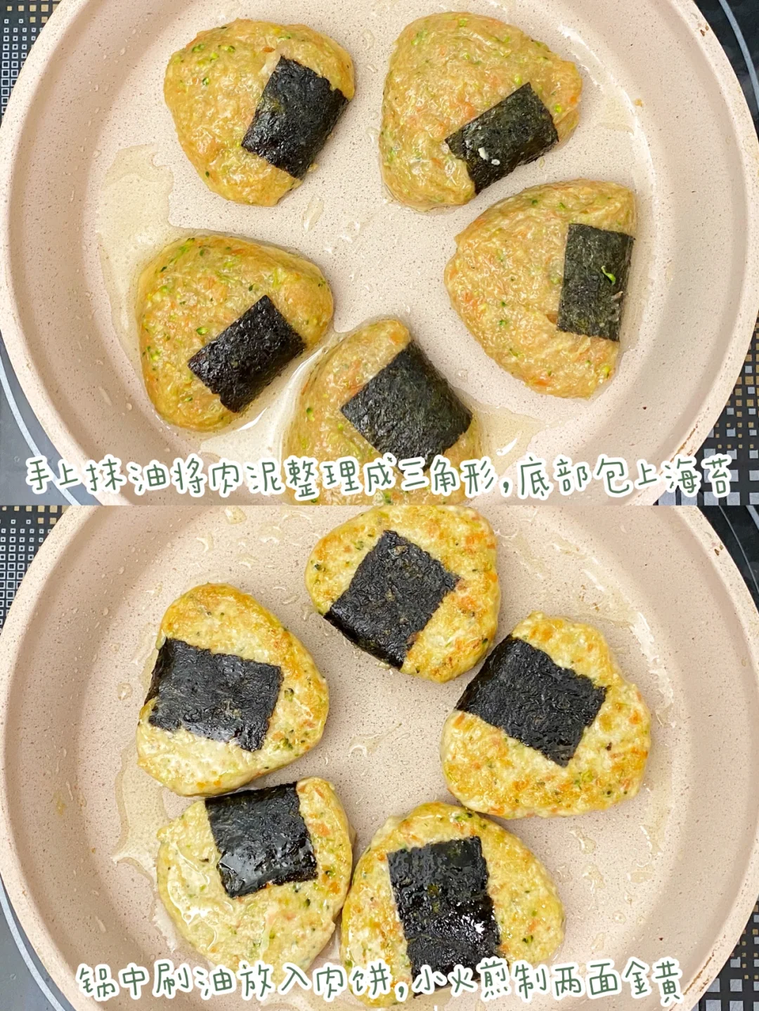3⃣️双手抹油防止粘手,将肉泥捏成三角形小饼形状,贴上海苔。