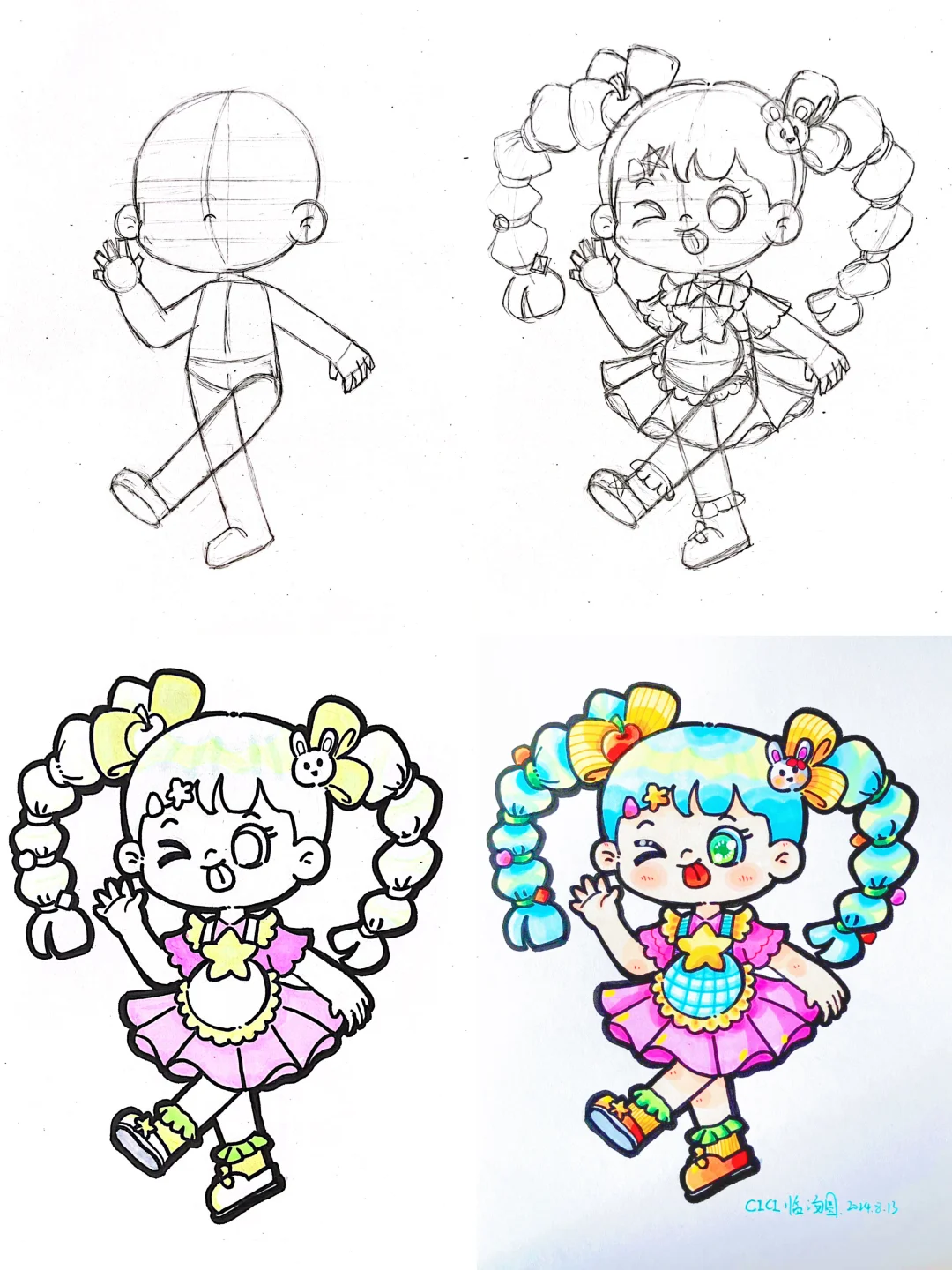 📚8月人物团练打卡,跟汤圆老师学习人物画法。 🎨练习人物的比例动态、发型五官、服饰搭配。 👩🏻🦰图1⃣️-5⃣️自创,人体动态参考李开心老师,工具:iPad Procreate ,左滑有步骤图。 👱🏻♀️图6⃣️-10临摹 ,涂完色才发现左边辫子画大了,右边的鞋子画小了😹。工具:美卡勒80色马克笔、宝克秀丽笔(小楷+中楷)、三菱高光笔。