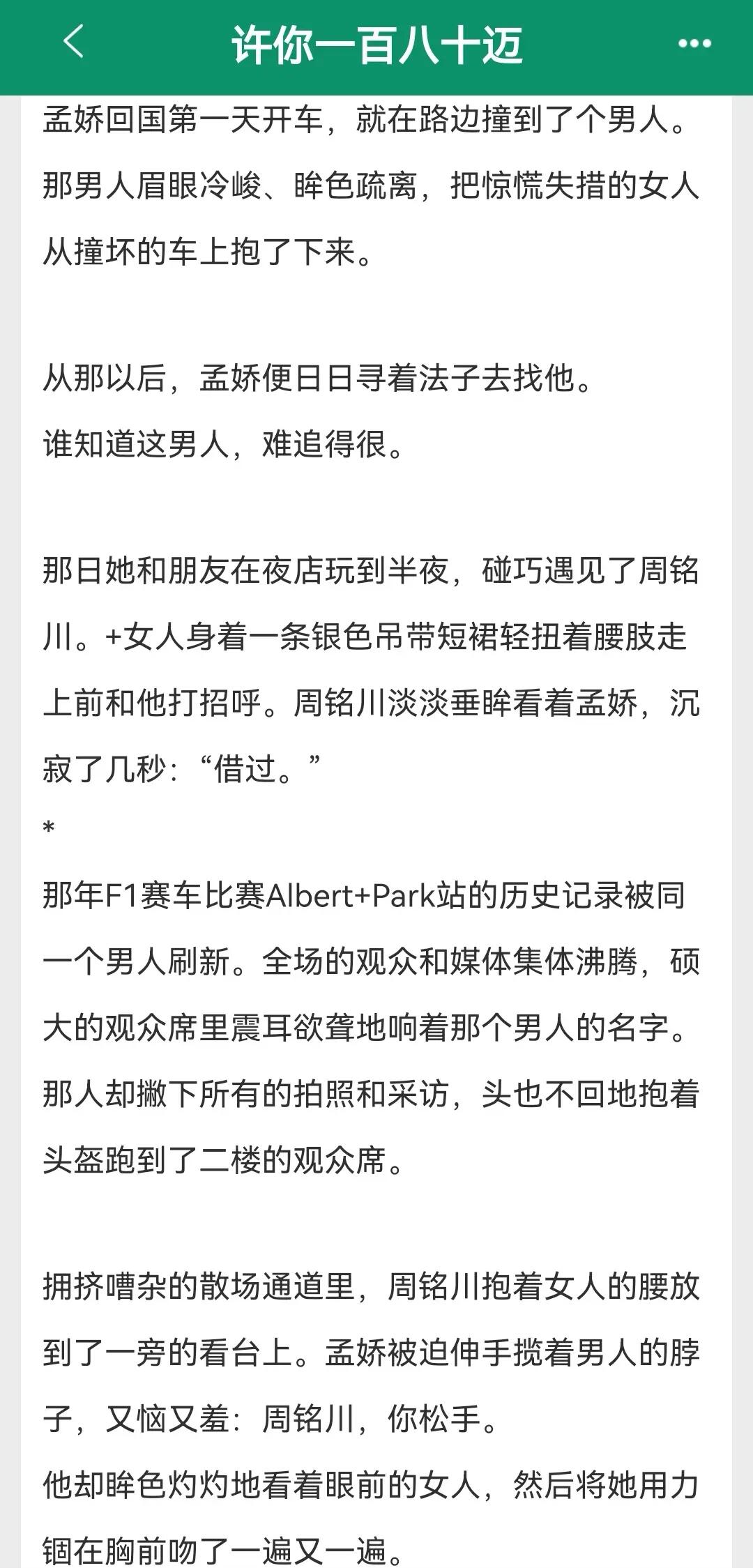 强推《许你一百八十迈》!!!这本真的超治愈超甜!!!男主以前就是天才赛车手,后来经历了一些不好的事情,有了心理障碍,退出赛场了,在一家汽车维修店工作,女主是修车的时候认识男主的。女主是有钱人家的大小姐,娇纵明媚,特别可爱,就是千金大小姐的样子,女主对男主属于一见钟情吧!这本前期是女追男,女主特别主动,男主步步沦陷!后面两人在一起之后超甜,女主给男主的世界重新带来了光明,让他一点点从过去的阴霾里走了出来,重新回到赛场了,一点一点重回巅峰!这本真的救赎感特别强,女主的陪伴和坚定好让人感动,男主也超爱她,也别感恩,所做的选择永远把让女主过上好日子刚在第一位,啊啊啊啊,巨好磕,喜欢救赎文宝子们,这本真的值得一入!!!