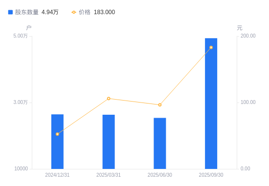 日期A股户数(户)流通A股户均持股数(股)户均持股市值(万元)2025-09-304937210144.47185.642025-06-302538519656.86189.692025-03-312632718953.52200.912024-12-312641818842.2098.792024-09-302163522784.6381.982024-06-302188522414.8659.962024-03-312081323569.3682.702024-02-292066723628.5595.932023-12-311911225516.91127.482023-09-301855026233.42157.27