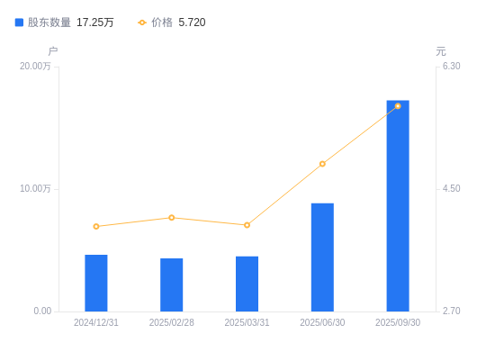 日期A股户数(户)流通A股户均持股数(股)户均持股市值(万元)2025-09-3017251612476.947.142025-06-308847117105.958.332025-03-314502433612.8113.342025-02-284333434923.6914.252024-12-314634932651.9012.902024-09-304442234068.3210.122024-06-304604418248.176.082024-03-314805817483.436.152023-12-315345116162.546.532023-12-085583915471.346.27