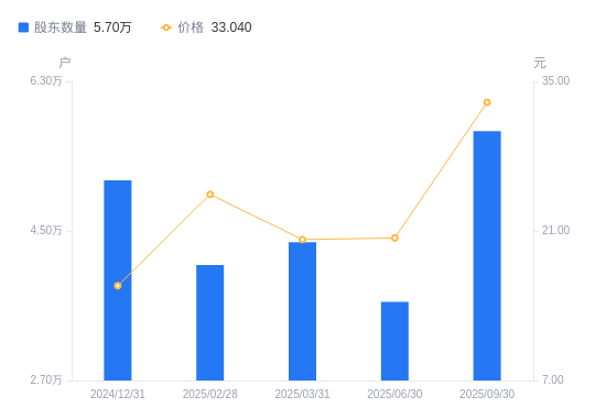 日期A股户数(户)流通A股户均持股数(股)户均持股市值(万元)2025-09-305700910812.0435.722025-06-303647716897.8734.372025-03-314363314126.5428.522025-02-284089615071.9736.812024-12-315107312068.6819.152024-09-304343314191.5922.552024-06-302489624758.3334.882024-03-312668923095.0432.912023-12-312285026975.2140.442023-09-302736322526.1725.09