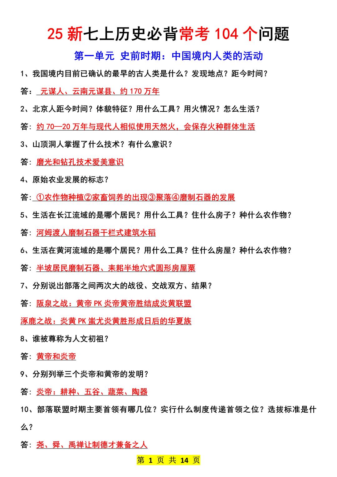 新七上历史真恶心,反反复复就考这173个问题 这是新版七上历史,火箭班班主任熬夜整理的 【常考的104个问题】 无论怎么出题,就考这104个问题 赶紧趁现在暑假,提前掌握, 开学就可以针对性提升了 早背早提升 老规矩:需要的家长自取[蹲后续H]