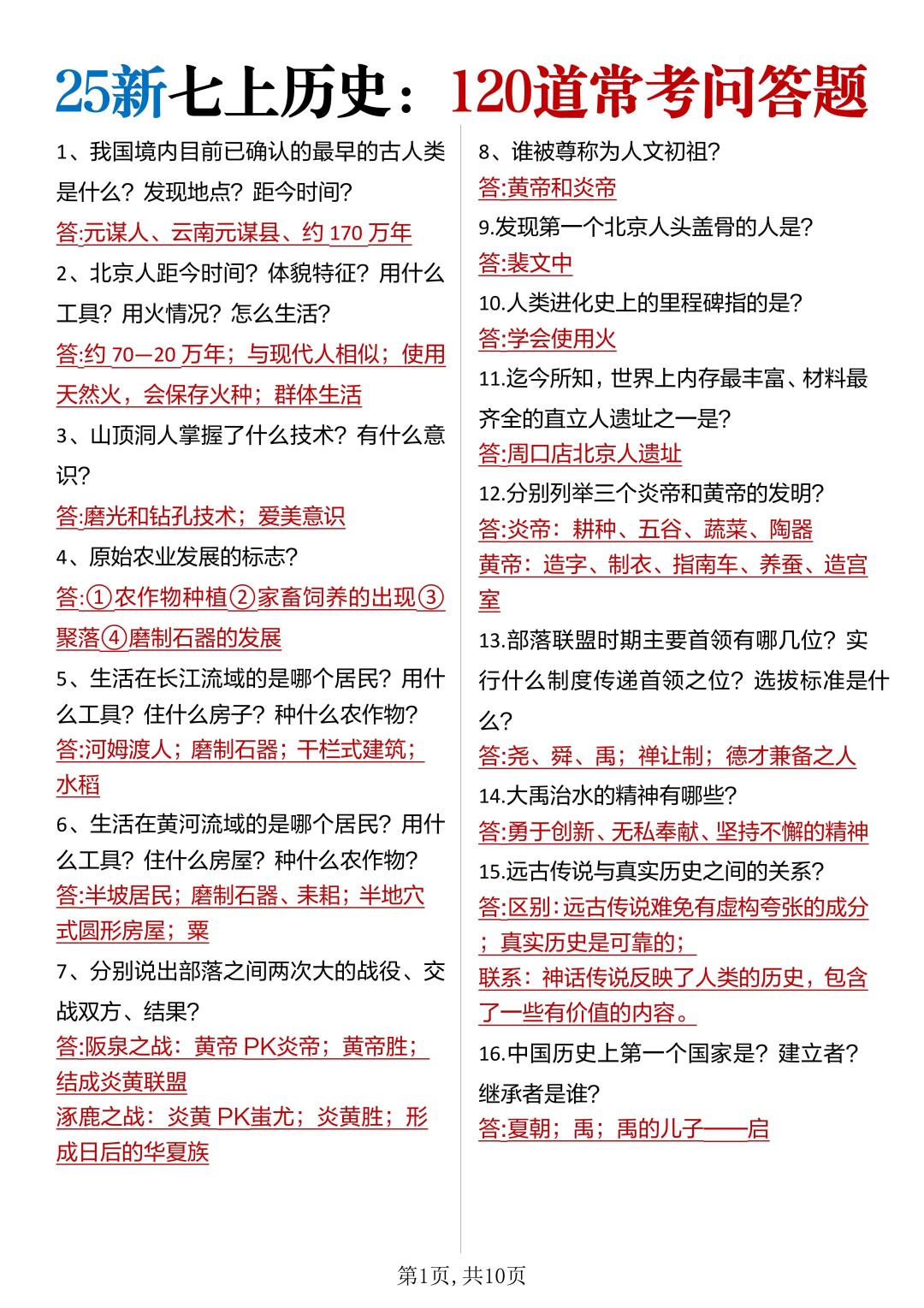 这是新版七上历史,火箭班班主任熬夜整理的 【常考的120个问题】 无论怎么出题,就考这120个问题 赶紧趁现在暑假,提前掌握, 开学就可以针对性提升了