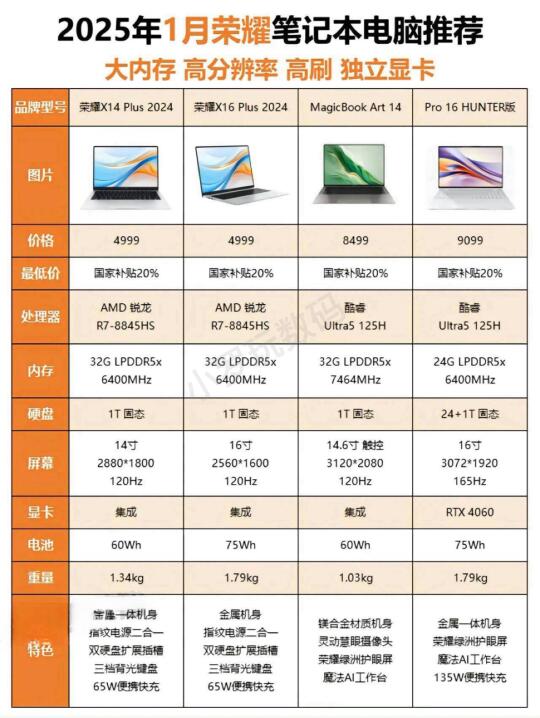 对于弱显卡需求,那就是荣耀X14 Plus和荣耀X16Plus这两款机型,要是有国补,4000的价格就能入手32G大内存配置,锐龙R7-8845处理器,核显性能也比较有口碑。