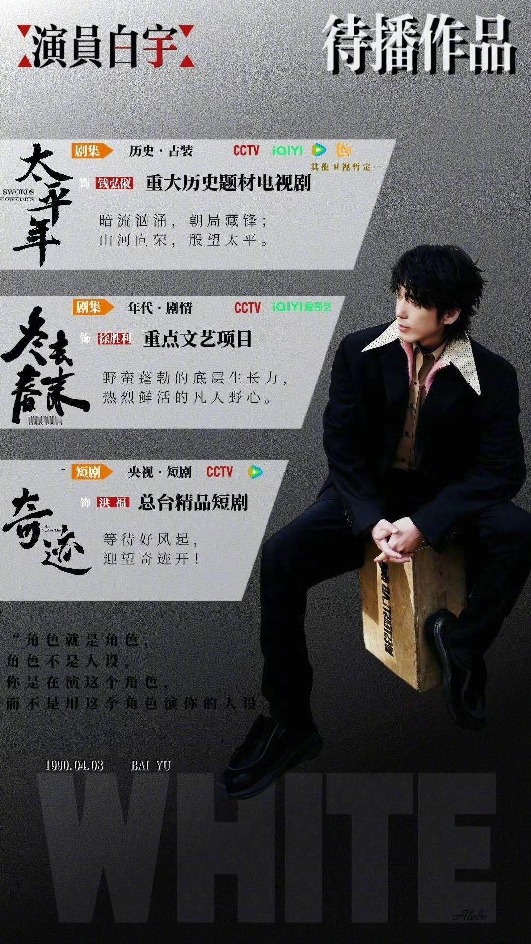 白宇是怎么做到量不多但很精的!一边是拍戏,今年拍了《冬去春来》和《奇迹》,一边是拿奖!在《冬去春来》杀青的同一天春燕奖也在北京举办发布仪式!凭《风起陇西》中的荀诩拿下优秀男主,领衔主演的《乔家的儿女》更是斩获优秀电视剧,实绩板再添重磅荣誉!今天一天多喜临门。待播作品还有古装正剧《太平年》,片花扑面而来的古味已经很going我了!这个白宇每部戏都题材都不同,但质量与效率都嘎嘎在线!就是这个宇子哥,爽!