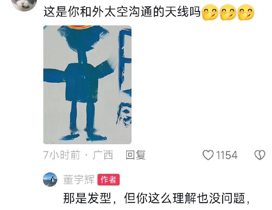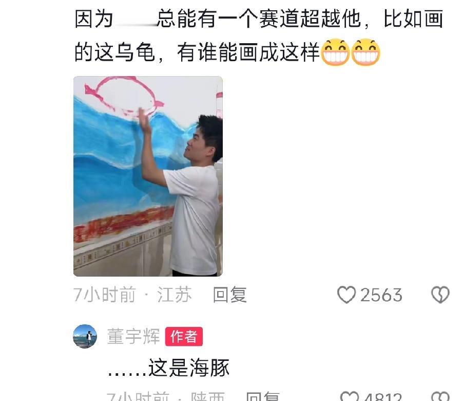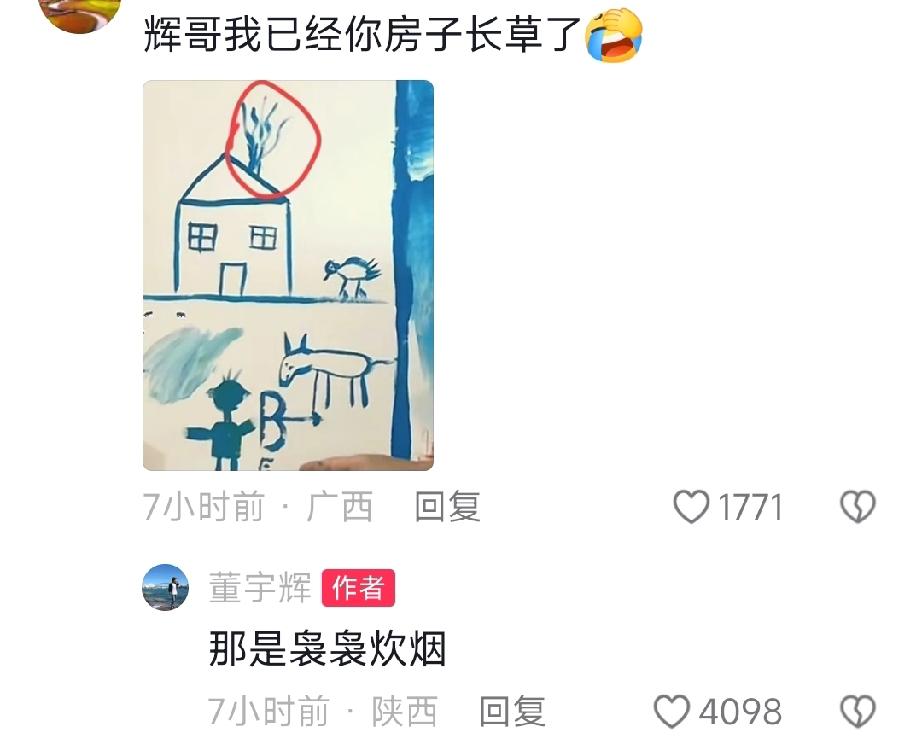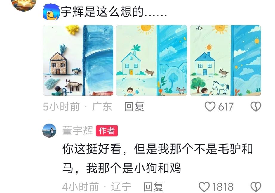 董宇辉今天真的是要被气晕在评论区里啦!举例如下: 一、明明是精心抓了个帅气发型,被评论区说成“头上顶个草堆”; 二、明明画了个“海豚”,被评论区说成画了个“乌龟”; 三、明明是画的“袅袅炊烟”,自认为浪漫而诗意,被评论区说成“辉哥,你房子上长草了”; 四、明明画了一个“带着智慧和思考的发型”,被评论区说成是“他和外太空沟通的天线”; 五、明明画的“小鸡和狗”被评论区说成是“毛驴和马”; 六、明明没有翠花已经很闹心,还被评论区P个翠花来气他。 综上所述,你说气人不? 董宇辉 与辉同行