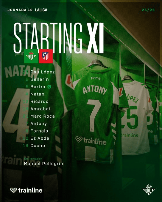 虎扑10月27日讯西甲第10轮,贝蒂斯主场迎战马德里竞技。赛前,双方公布首发阵容:
