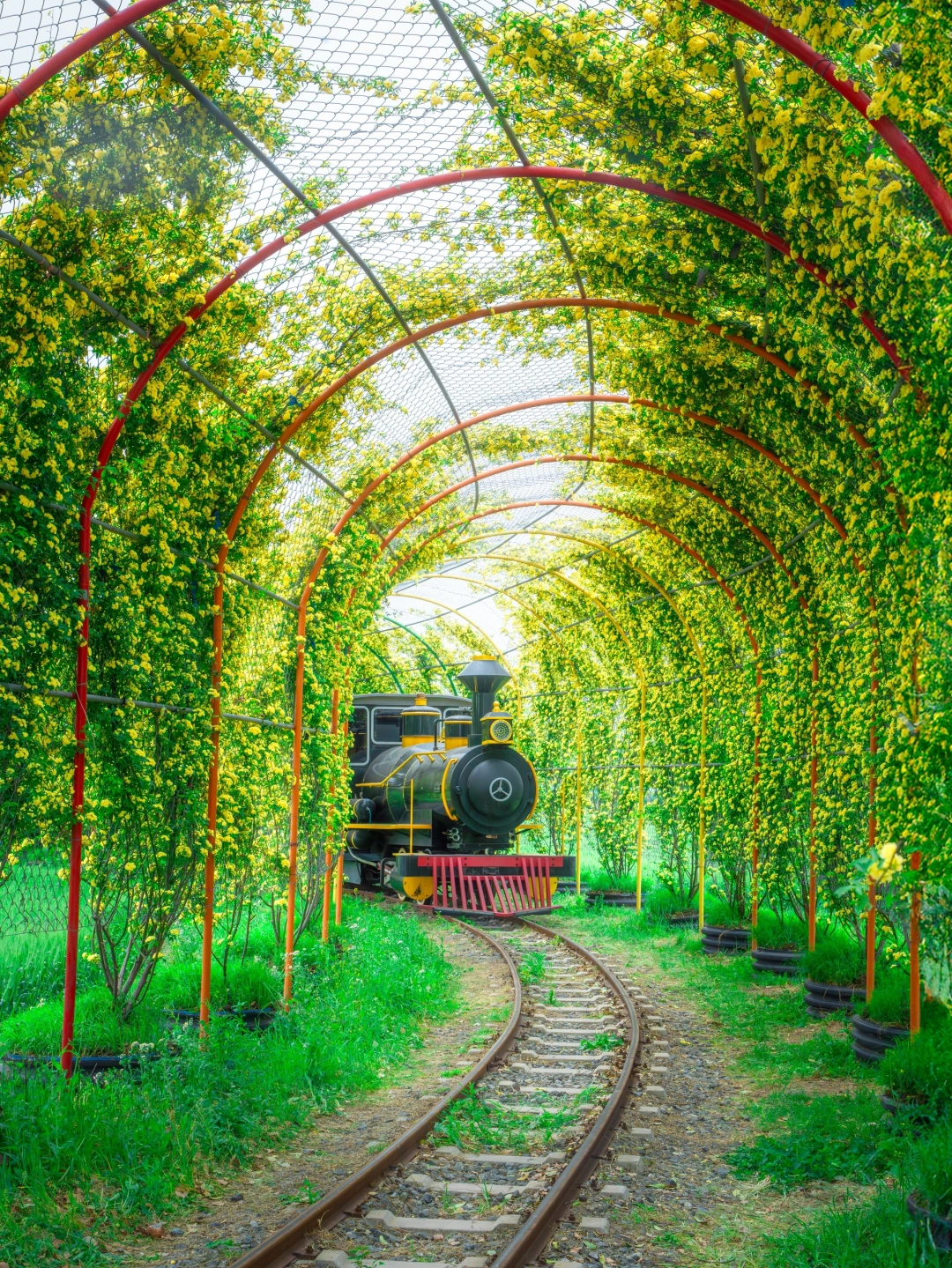 ✅东林村:网红稻田小火车,📍东林小火车就到!前面有个紫藤花廊很出片,沿着彩虹道过桥右转就能看见!