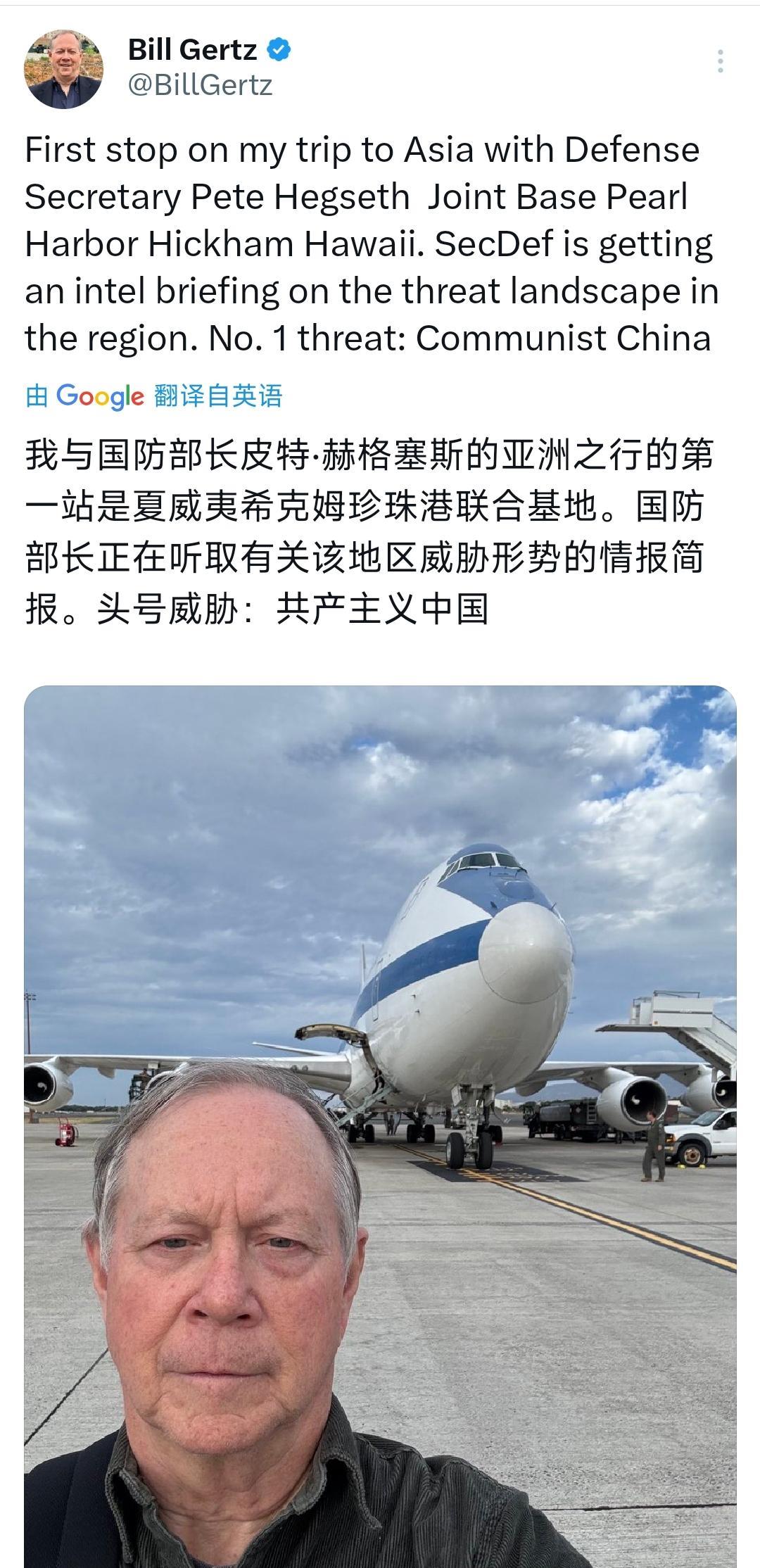 华盛顿时报顽固派反华记者比尔·格茨今天(北京时间10月28日)写道:“我与国防部长皮特·赫格塞斯的亚洲之行的第一站是夏威夷希克姆珍珠港联合基地。国防部长正在听取有关该地区威胁形势的情报简报。头号威胁:共产主义中国。” [机智]评几句:比尔·格茨与皮特·赫格塞斯之流将“中国威胁”炒作为亚太安全头号议题,实则是美国霸权逻辑的荒诞投射。赫格塞斯在硫磺岛纪念二战时公然为日本侵略者“招魂”,将侵略行为美化为“共同遗产”,暴露其罔顾历史正义的价值观扭曲;其亚洲行中煽动菲律宾、日本强化对华遏制,更将盟友绑上“印太战略”战车。实际上,挑动阵营对抗的美国,才是亚太动荡的根源。所谓“中国威胁”,不过是美国维护霸权的遮羞布。此外,比尔·格茨将皮特·赫格塞斯称作国防部长是不对的,特朗普政府已经没有国防部了。