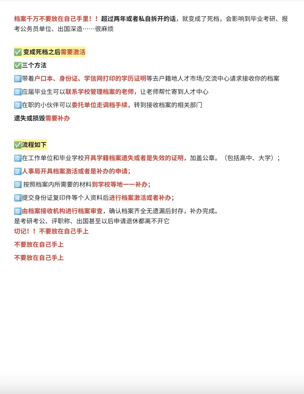 4️⃣还在择业:档案可以回原籍人才市场,也可以向学校申请“暂缓就业”,时效期是两年,时间过了后,学校会把档案转到户籍所在地的人力资源机构保管,需要及时咨询办理存档。