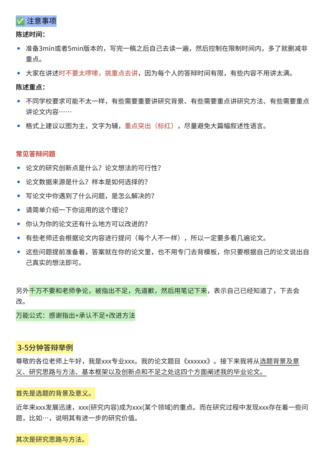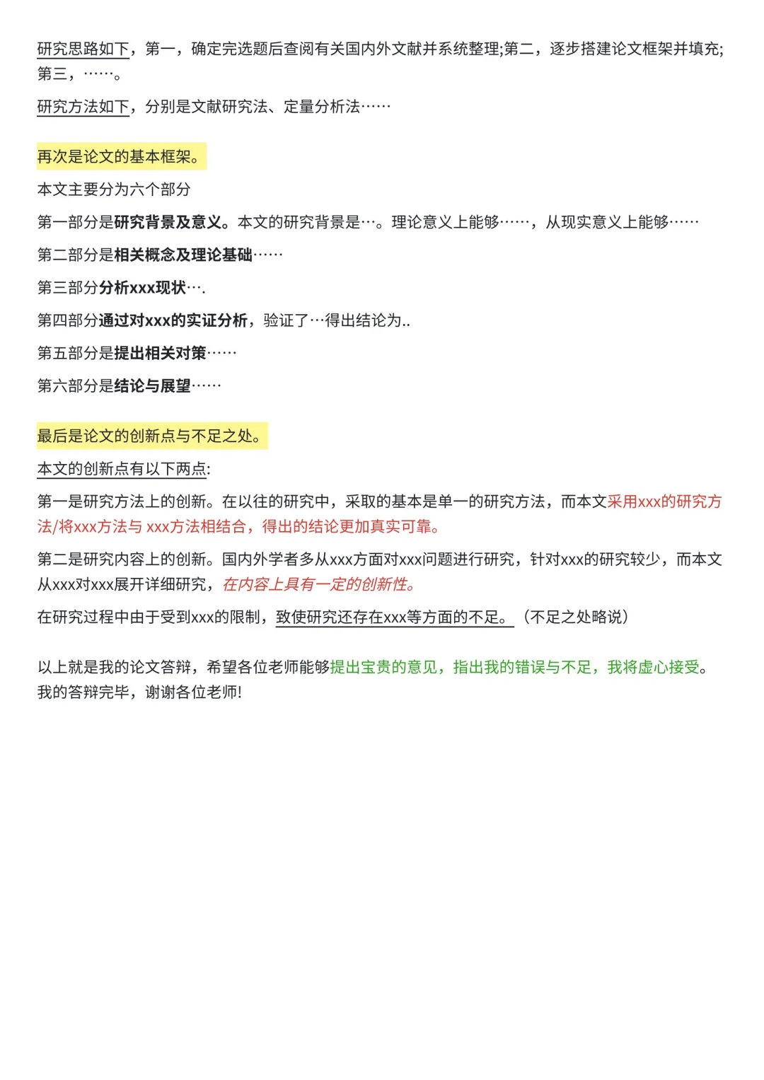 🌟 5句话万能模板稳过 第一句,开场白介绍你是谁,留论文主题是什么,话术参考,截图保存。 第二句,说一下论文的研究背景和意义,说一下国内外现状,稍微高大上一点,多加一点图片,实在不会可以从论文摘要,开题报告里面提炼。 第三句,具体展开论文内容研究的几个部分,提炼一下主旨。 第四句,总结一下论文的核心的研究方法,那比如你用了调查问卷啊,做了哪些研究啊。 第五句,结束语,以上就是本次论文答辩的全部内容,还请各位老师批评指正。