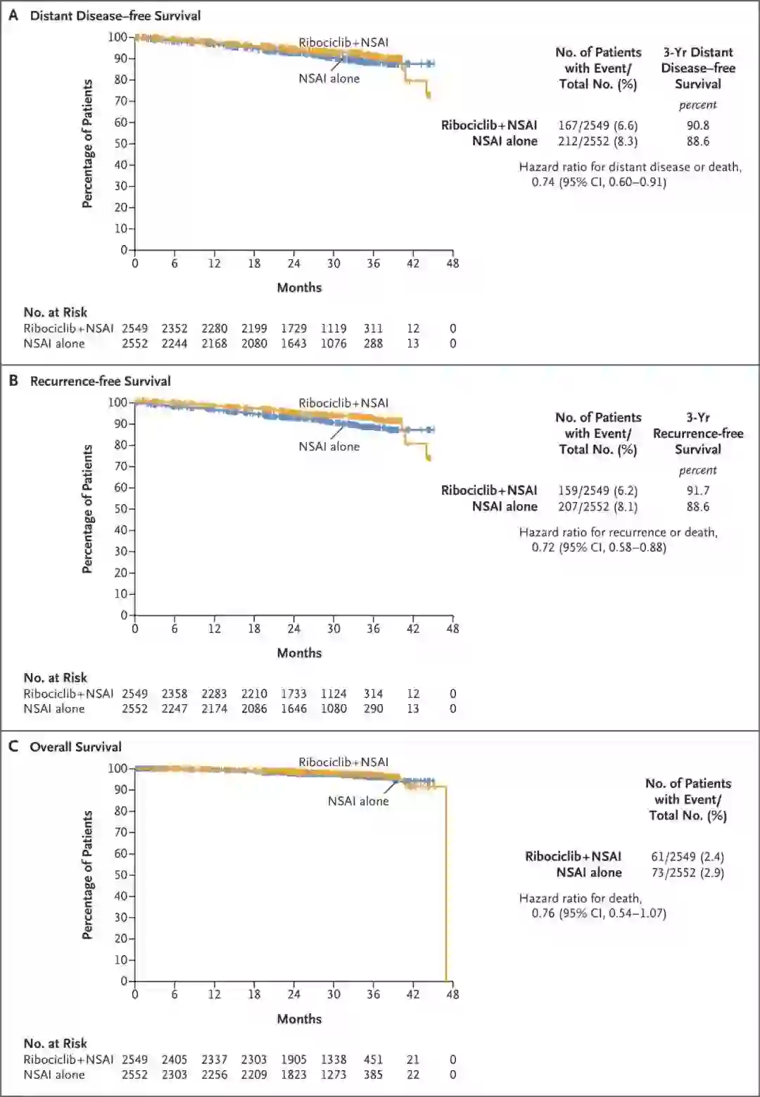 备注:研究入组标准主要为:II期至III期、激素受体阳性、HER2阴性早期乳腺癌女性和男性。对于IIA期乳腺癌(T2N0)患者,还需要至少满足以下条件之一:肿瘤分级为2级且Ki-67≥20%、基因组风险高、3级。