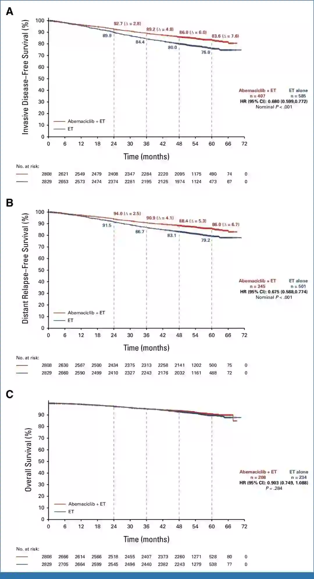 对于同时满足monarchE和NATALEE标准的患者,指南专家组指出,两种CDK4/6抑制剂相比,阿贝西利的随访时间较长、随着时间推移获益幅度不断扩大、疗程较短、已被美国食品药品监督管理局批准用于辅助治疗。在这种情况下,指南专家组赞成首选阿贝西利。