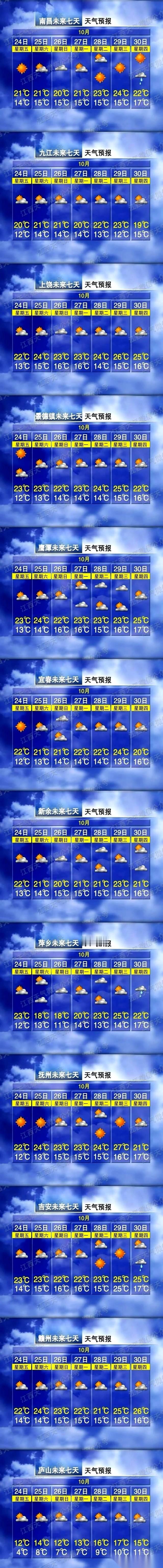 27度!朋友们,27度! 我前脚刚把夏天的短袖塞进箱底,它后脚就给我整这一出。 今天这太阳好的,暖洋洋的,跟不要钱似的,晒得人骨头都酥了。恍惚间我甚至怀疑,是不是霜降这个节气记错了日子? 但你千万别上当! 这都是“骗局”。 老天爷憋着坏呢。月底之前,还有两波冷空气的KPI要冲刺。 一波是周三周四(25-26号),另一波直接给你安排在月底最后两天。 所以啊,现在窗外这点温暖,就是最后的温柔了。 该洗的抓紧洗,该晒的抓紧晒,想穿小裙子出去浪的也别犹豫了。 不然等过两天,江西天气就要开始表演它的传统绝活儿了: “气温满30减15”。 一年四季随机播放,主打一个心跳。行吧,我已经被拿捏得死死的了。