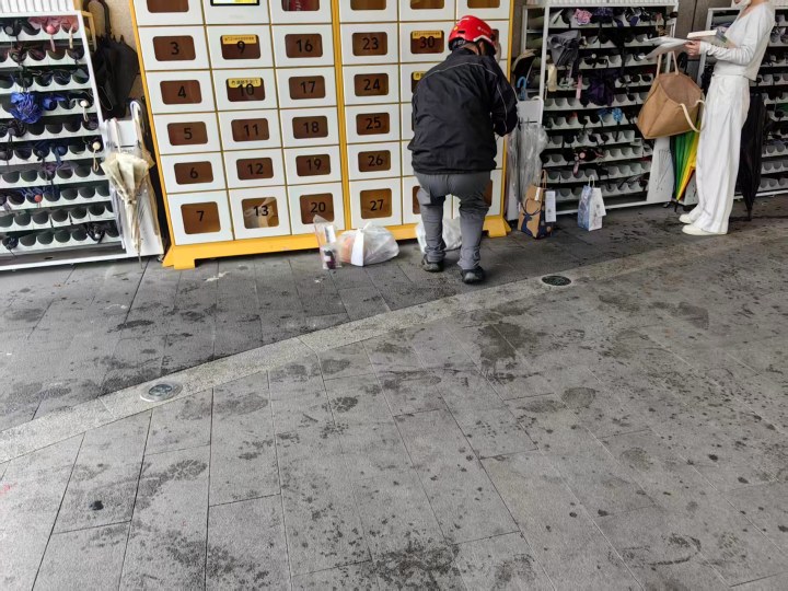 中午,外卖小哥把外卖放在一楼的储物柜前,图书馆里不时有人出来认领。