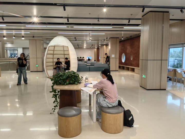 图书馆工作人员介绍,元驿站有144个位子,其中一半需要提前在网上预约,另一半先到先得,需要排队进入。特别是双休日和节假日,这些座位炙手可热,有人离开很长时间,座位空空的,后面等的人也很有意见。