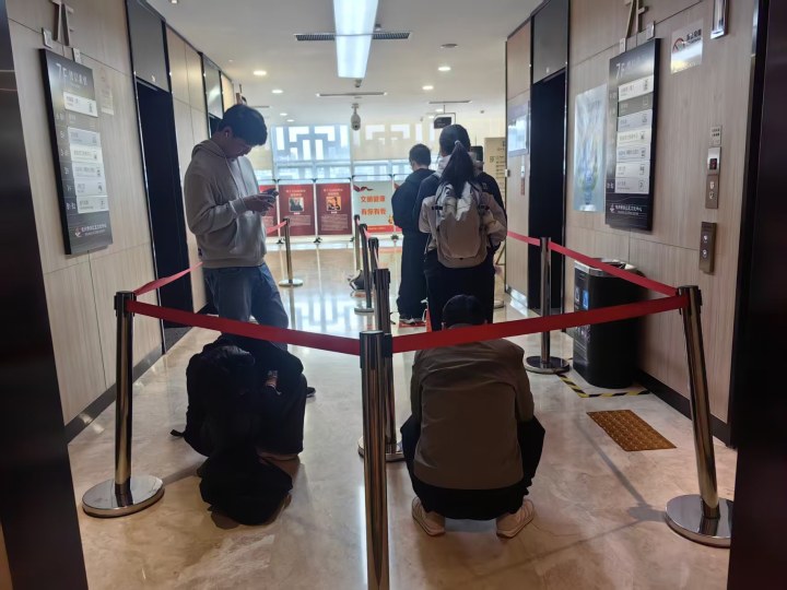 小李蹲在地上,旁边是她的大背包,里面装着笔记本电脑。小李说,早上起得太早,有点犯困。这一周要完成一篇论文,这周每天都来图书馆。
