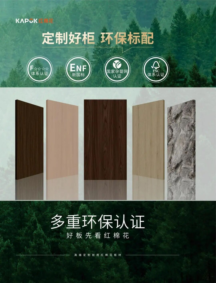 在全球家居市场日益重视可持续发展的今天,红棉花板材凭借其卓越的环保性能,为“中国智造”出海树立了品质标杆。红棉花板材不仅达到当前国标的ENF级环保等级,更获得了日本F☆☆☆☆、国际FSC认证等多项国际权威环保资质,构建起覆盖全球主流市场的环保认证体系。