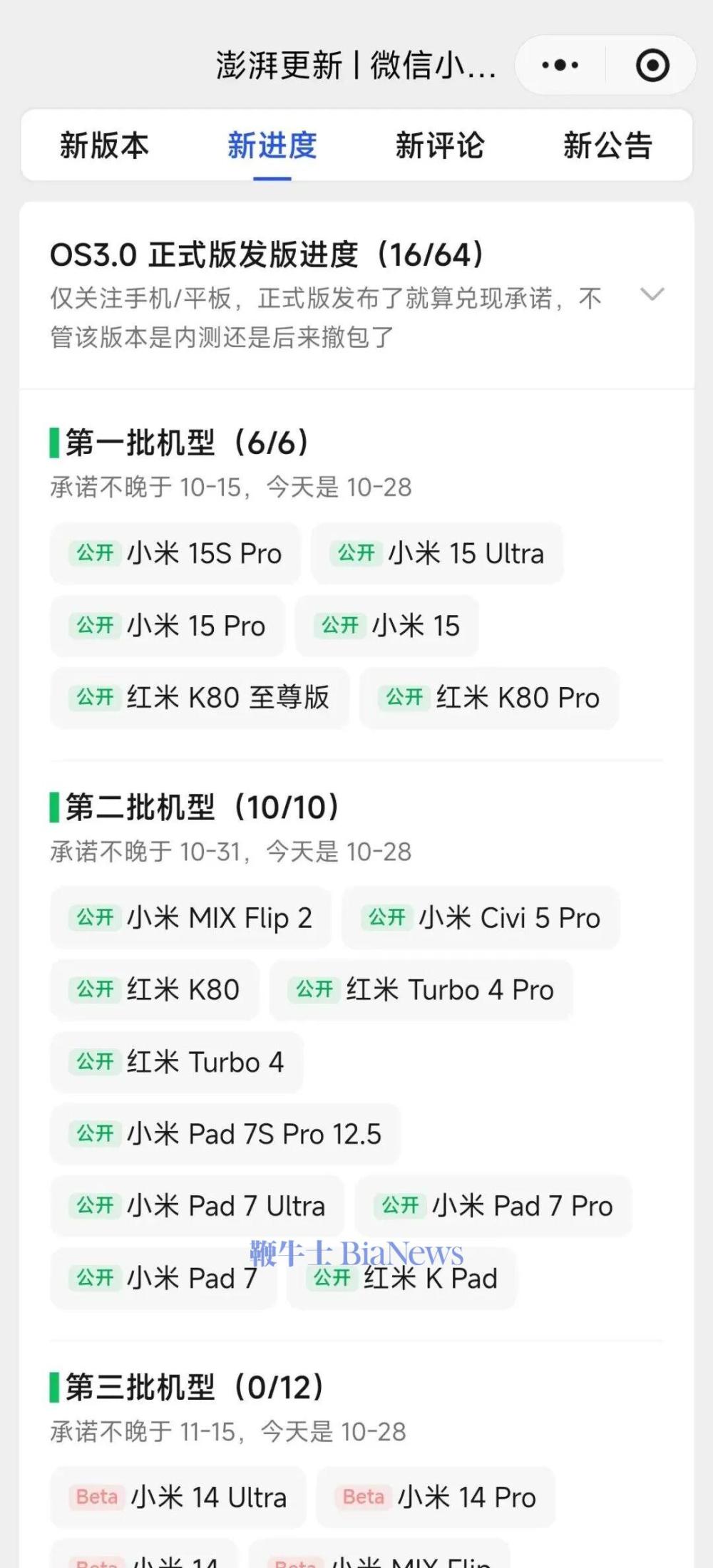 10月28日,澎湃OS3开始向第二批机型推送正式版,第二批一共十款机型,一次性发版,并且跳过了内测,直接公开推送。
