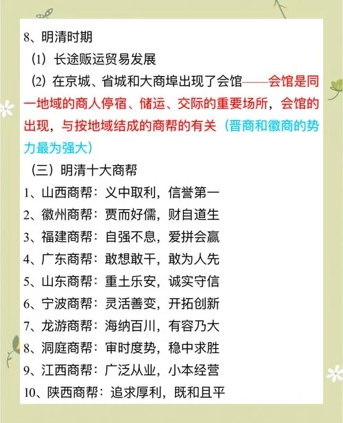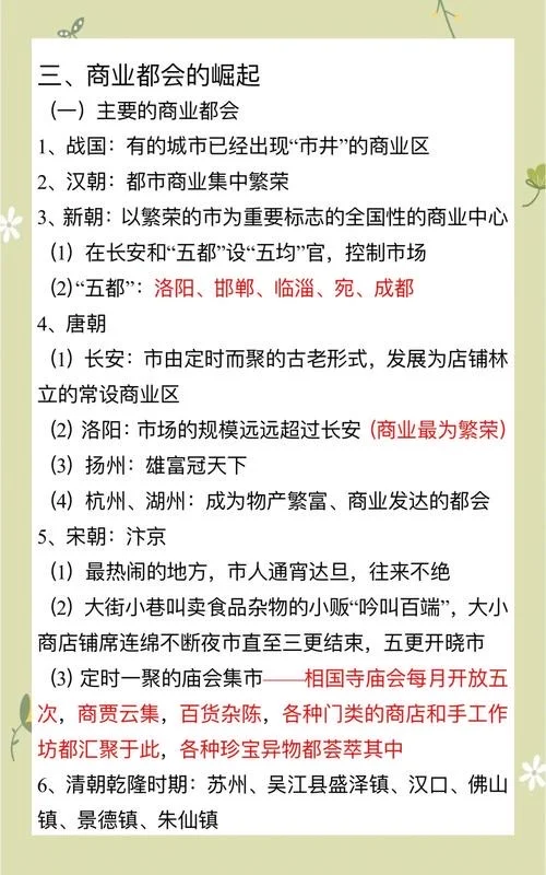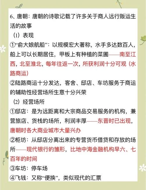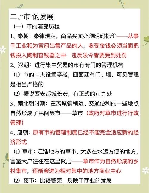 古代中国的商业发展对中国经济产生了深远的影响。随着商业的繁荣,城市的兴起和商业中心的形成,古代中国的经济面貌发生了显著变化。 📈 商业发展与经济进步 古代中国的商业活动促进了经济的繁荣。市场的形成和发展,使得商品交易更加便捷,推动了经济的进步。 🏯 市的演变 古代中国的“市”逐渐发展壮大,形成了完备的市场体系。市场的存在为商人提供了交易的平台,促进了商品流通。 🏙️ 因商业而兴的城市 许多古代城市因商业的繁荣而兴起,成为重要的商业中心。这些城市不仅推动了当地经济的发展,还对中国整体的商业活动产生了重要影响。 🎭 反映商人生活的文学作品 古代小说、戏曲等文学作品反映了商人的生活。例如,《水浒传》、《三言二拍》和《琵琶行》等作品,通过生动的故事情节,展现了商人的生活状态。 💼 晋商与徽商 晋商和徽商是古代中国两大著名的商帮。晋商以山西籍商人为主,活跃于明清时期,经营范围广泛,对中国商业经济和对外贸易的发展做出了重要贡献。徽商则以安徽籍商人为主,活跃于大江南北,对中国商界产生了深远影响。 🏛️ 市署与市场管理 市署是管理市场的机构,负责市场的日常管理和商品的真伪辨别。唐代长安和洛阳的市署管理财货交易度量器物,确保了市场的公平交易。 🌱 草市的意义与特征 草市是对官办贸易的有利补充,自然形成的乡村集市后来演进为相对集中的商业中心,有力地推动了中国古代商业经济的发展。草市远离城镇,分布在交通便利的城市,是自然形成的民间集市,受到政府商业机构的管理。 🚫 唐代对商业的控制 唐代政府对商业的控制依然比较严格,禁止高官从事商业活动,体现了政府对商业活动的重视和管理。 通过这些历史事件和人物,我们可以看到古代中国商业经济的发展脉络和重要影响。