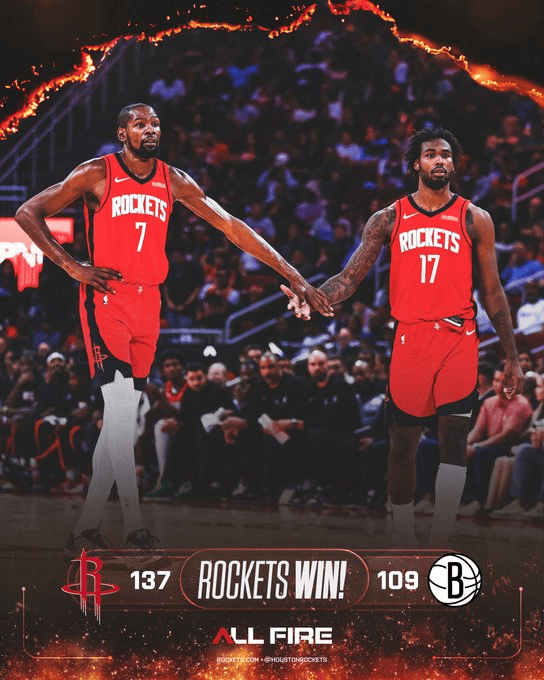 赛后,火箭官方晒出赢球海报:杜兰特、伊森登上封面。