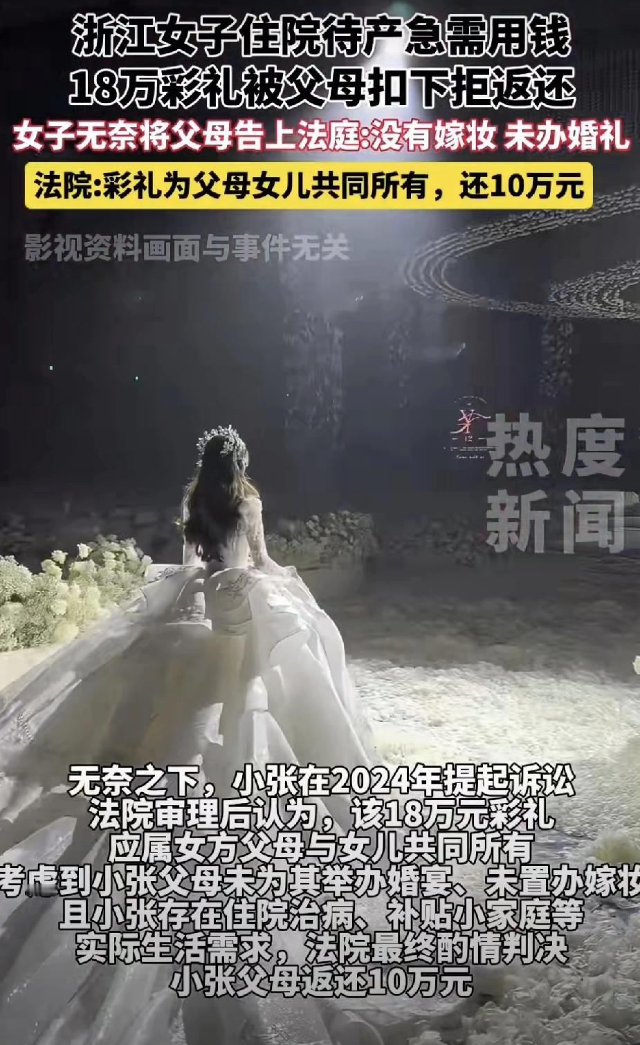 台州一女子,嫁人后家里条件不宽裕,想从爸妈手里把那18万彩礼拿回来贴补家用,结果次次吃闭门羹。最惨的是她后来住院急用钱,爸妈还是咬死不松口。女子一咬牙,直接把亲爹亲妈告上法庭,非要讨回那18万。 据说女子出嫁那天,爸妈不仅没为其置办任何嫁妆,连杯喜酒都没请,就把18万彩礼都揣到兜里。彩礼嫁妆本来是两家人用来扶持一个小家庭的,居然想都揣到自己兜里。果然是嫁出去的女儿泼出去的水,能省一分是一分啊[笑哭]。彩礼