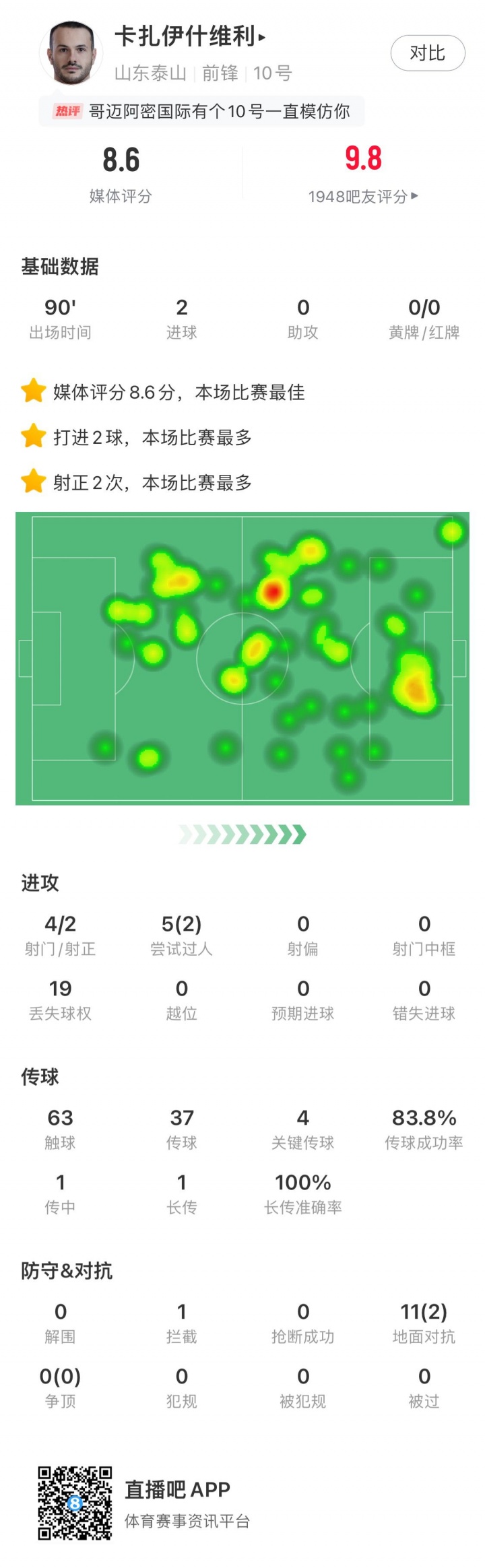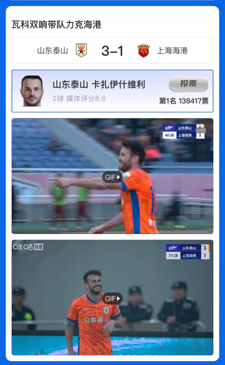 [直播吧]中超第28轮最佳评选结果出炉,卡扎伊什维利第五次当选最佳!在与上海海港的较量中,卡扎伊什维利梅开二度,攻入联赛第24球,帮助山东泰山3-1击败上海海港,捍卫大球场,领跑射手榜!