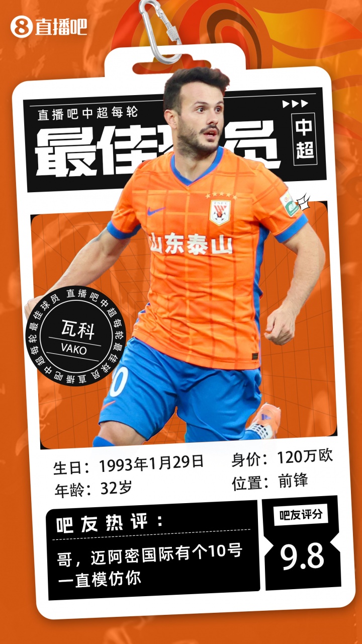 [直播吧]中超第28轮最佳球员评选得票率前三