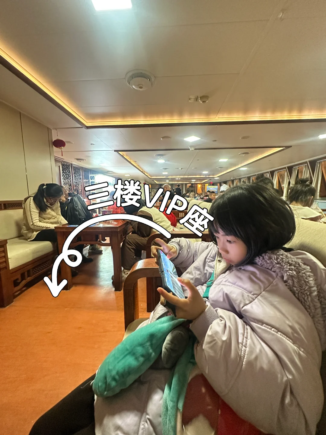 7️⃣一般司机停好车后,就可以上船先找位置了,建议直接上三层,VIP座,50r/人(送一杯咖啡☕或茶)小孩1.5m以下免费!比一二层的普通座位舒服太多了!