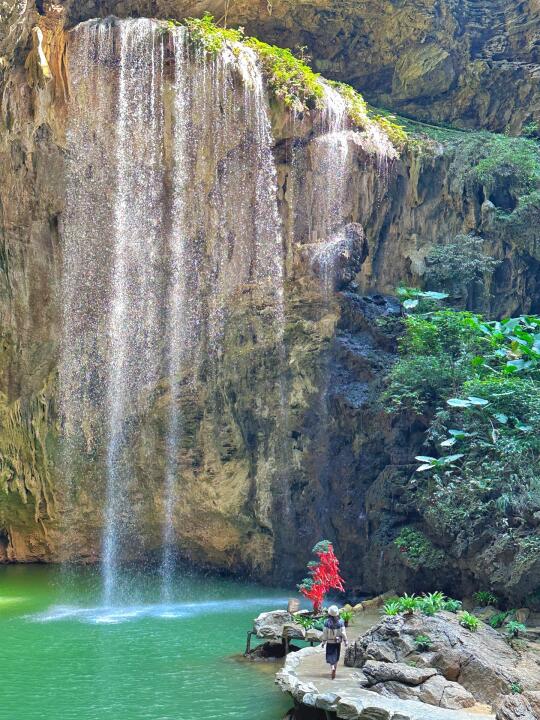 🚶♀先沿着栈道步行进入,近距离感受钟乳石在大自然雕刻下的鬼斧神工,顺便给娃科普喀斯特地貌,中间的巨大天坑,在上午能拍到光束照进来的丁达尔效应!