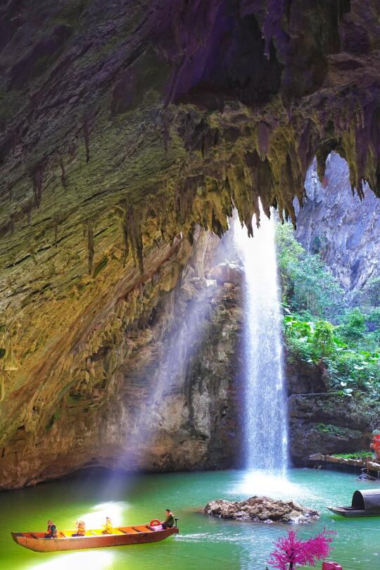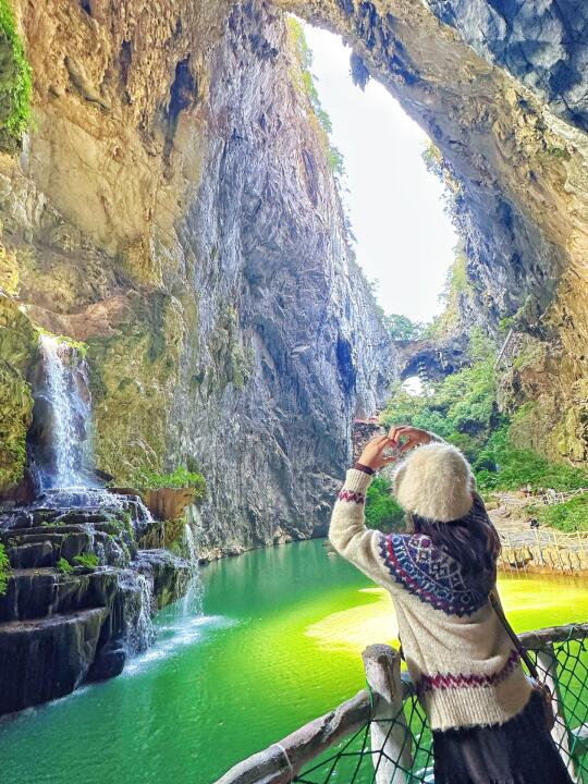 走进溶洞,没想到竟然别有洞天!小朋友第一次去这么特别的地底世界,巨大的天坑就像天空中破了一个洞,阳光洒进来,照在喀斯特地貌的钟乳石上,形成丁达尔效应,从此光便有了形状!碧绿的湖水滋润着天坑里的植被。身临其境,只能感叹大自然的鬼斧神工!