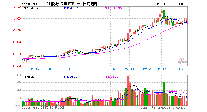10月28日,截止午间收盘,新能源汽车ETF(516390)涨1.02%,报0.995元,成交额1206.57万元。新能源汽车ETF(516390)重仓股方面,宁德时代截止午盘涨1.51%,汇川技术涨0.23%,比亚迪涨0.15%,长安汽车跌0.63%,三花智控涨4.24%,亿纬锂能涨2.93%,华友钴业跌2.60%,赣锋锂业跌0.05%,国轩高科跌0.13%,天齐锂业涨0.30%。